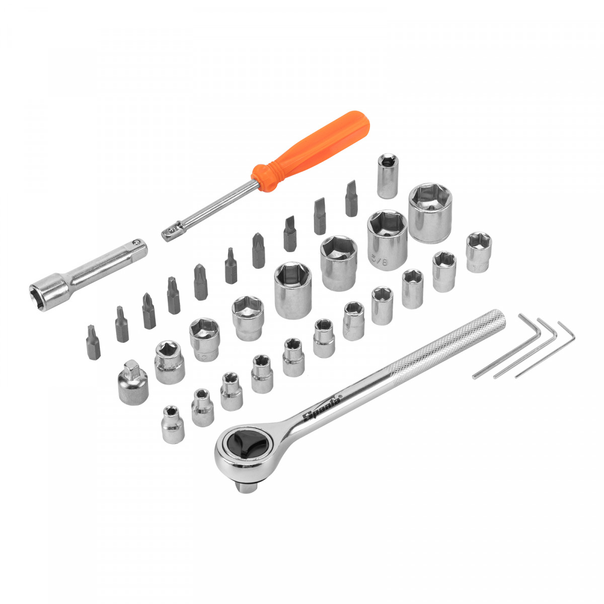 Набор Sparta 13541 содержит 37 предметов для проведения слесарно-монтажных работ. Он оптимально подходит для бытового применения, будет полезен начинающим мастерам. С помощью набора осуществляется монтаж/демонтаж резьбового крепежа.
