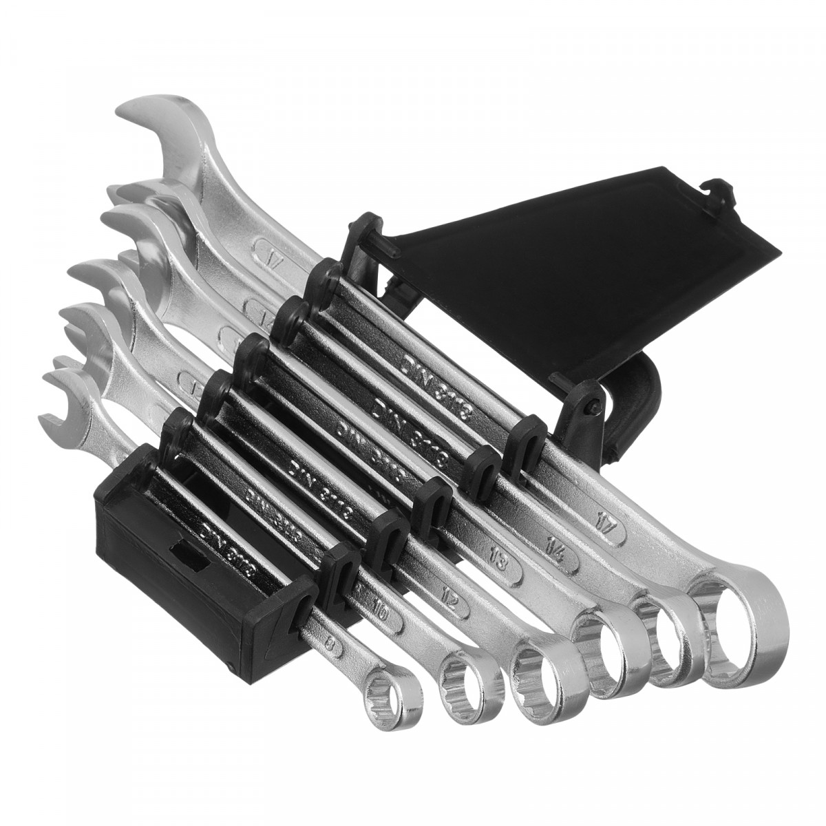 Набор комбинированных ключей Сибртех 15446 включает в себя 6 инструментов из стали CrV для работы с резьбовыми крепежами диаметром от 8 до 17 мм. Каждый ключ снабжен рожковым и 12-гранным кольцевым зевом, который максимально плотно соприкасается с поверхностью гайки или болта — это уменьшает риск ее деформации. Набор незаменим при ремонте автомобиля, а также будет полезен для сборки техники или решения бытовых задач.