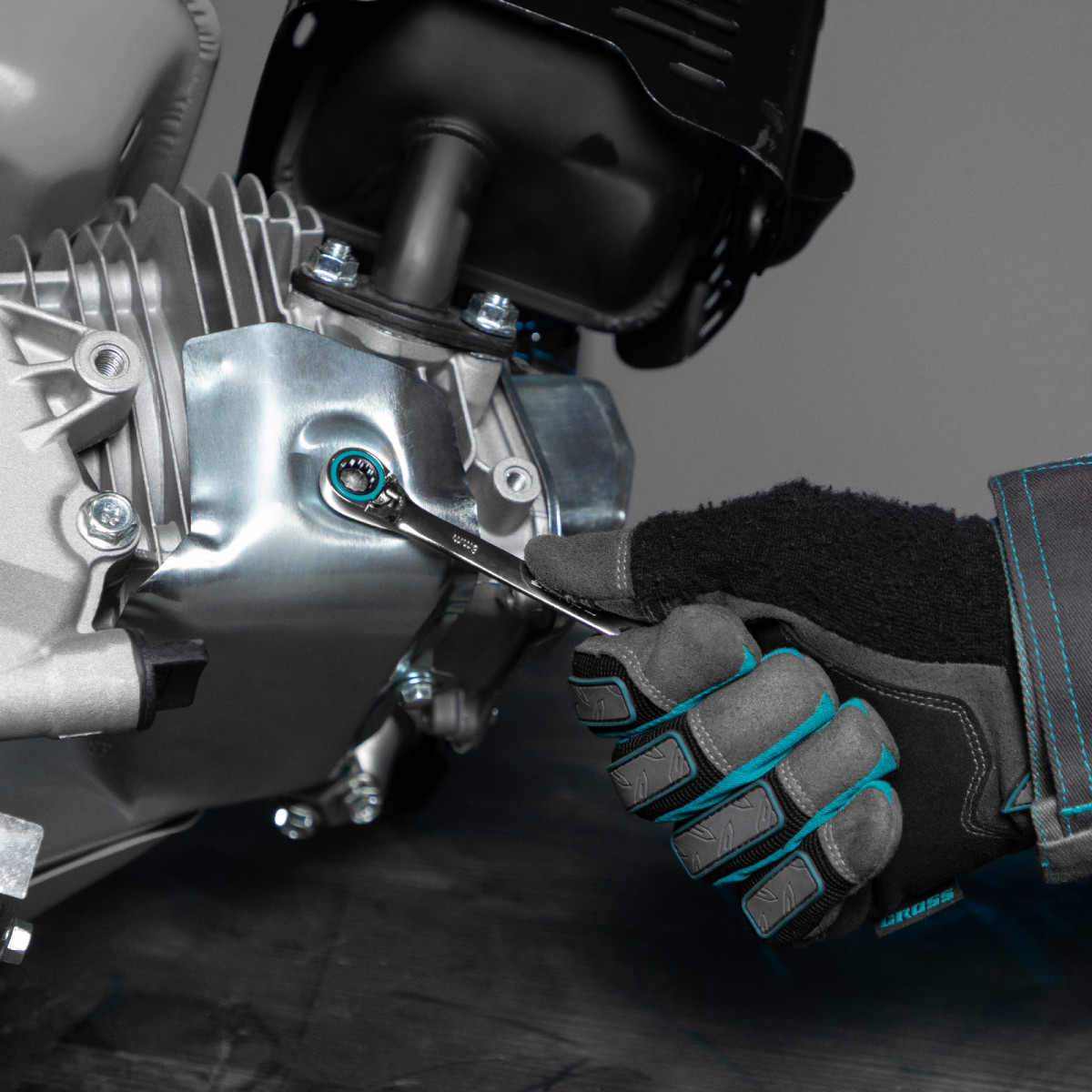 Набор комбинированных реверсивных ключей с трещоткой Gross 14892 используется для монтажа и демонтажа болтов и гаек и включает 7 инструментов размером от 8 до 19 мм, выполненных из стали CrV. Каждый из них имеет две рабочие головки — рожковую и накидную, что расширяет возможности применения. У накидной головки 12-гранный профиль, благодаря чему она надежно захватывает крепеж. Наличие реверса упрощает работу с резьбовыми соединениями. Набор подходит как для профессионального, так и для самостоятельного ремонта автомобилей.