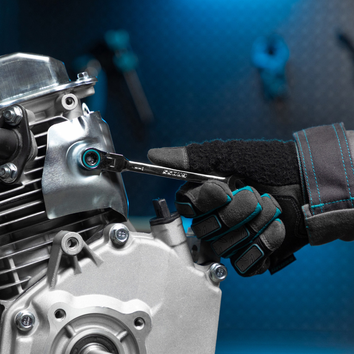 • Работа с крепежами в разных плоскостях — накидные головки с шарнирным механизмом изменяют свое положение на 180 градусов по вертикали.