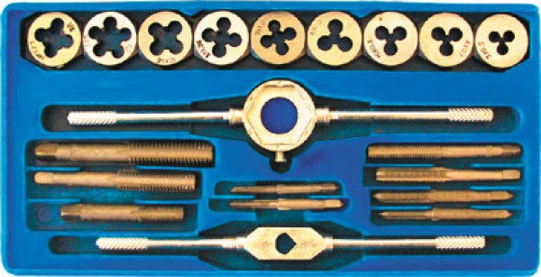 Для труб из цветных металлов при мелком бытовом ремонте. В наборе: метчикодержатель, леркодержатель, 9 метчиков и 9 лерок. Материал: инструментальная сталь.