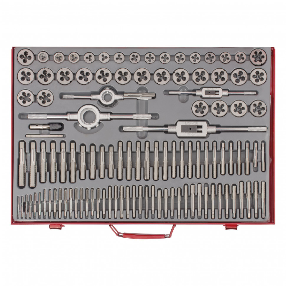Набор метчиков и плашек М2-М18 Matrix 773110 в металлическом кейсе состоит из 110 предметов — резьбонарезных инструментов и держателей для них. Они позволяют нарезать внутреннюю и наружную резьбу, а также используются для восстановления сорванной резьбы. Благодаря наличию метчиков разного типа набор подходит для работы как со сквозными, так и с глухими отверстиями. Набор будет полезен в сервисном центре, авторемонтной мастерской, а также в быту.