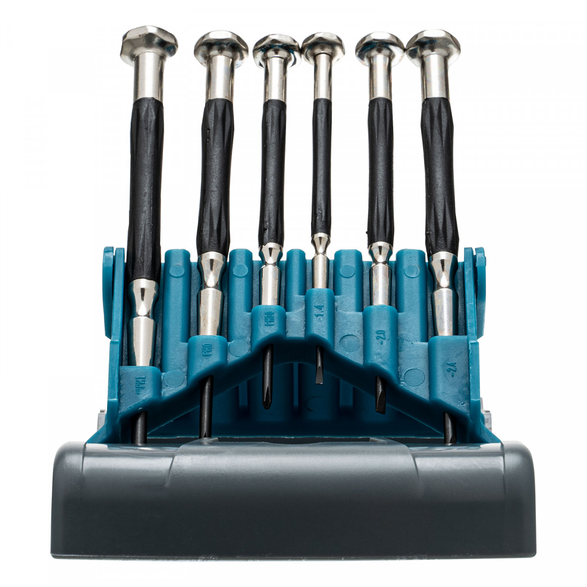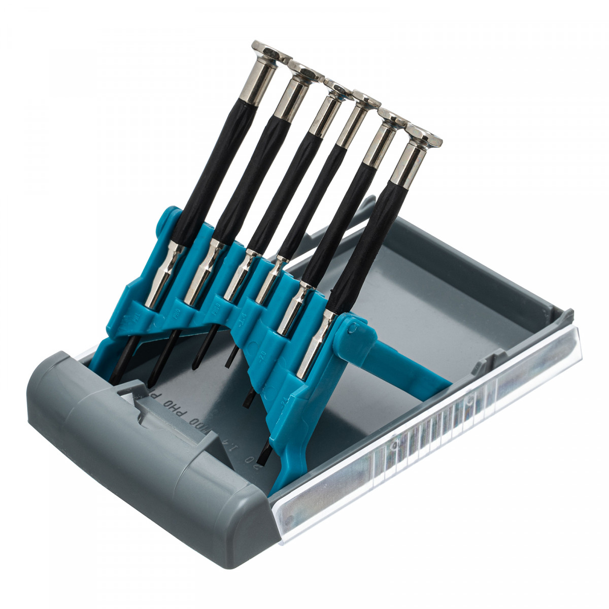 Набор отверток для точной механики Gross 13346, CrMo, с металлическими обрезиненными рукоятками, 6 предметов в боксе-трансформере, пригодится при монтаже/демонтаже микровинтов SL и PH. Высококачественное исполнение деталей набора позволяет использовать его для решения профессиональных задач в ходе ремонта электроники, очков и других мелких механизмов.