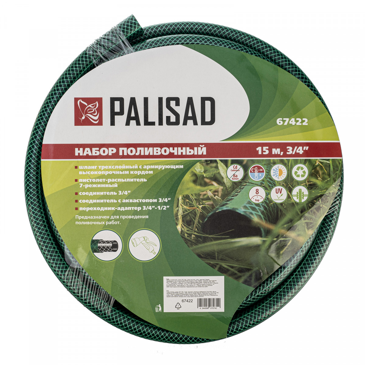 Набор поливочный, шланг 3/4", 15 м, 7 режимов пистолет, соединитель, адаптер Palisad