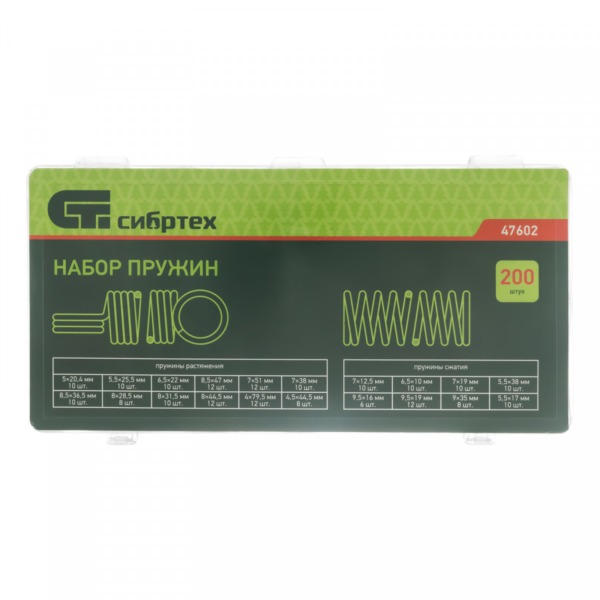 Набор Сибртех 47602 включает 200 пружин размером 5,5 х 17, 5,5 х 35, 6,5 х 10, 7 х 12,5, 7 х 19, 9 х 35, 9,5 х 16 и 9,5 х 19 мм. В комплект поставки входят пружины как инструментальные, так и общего назначения. Большой размерный ряд позволяет выбрать наиболее подходящую деталь. Набор из 200 предметов будет полезен в ремонтной мастерской и в быту.