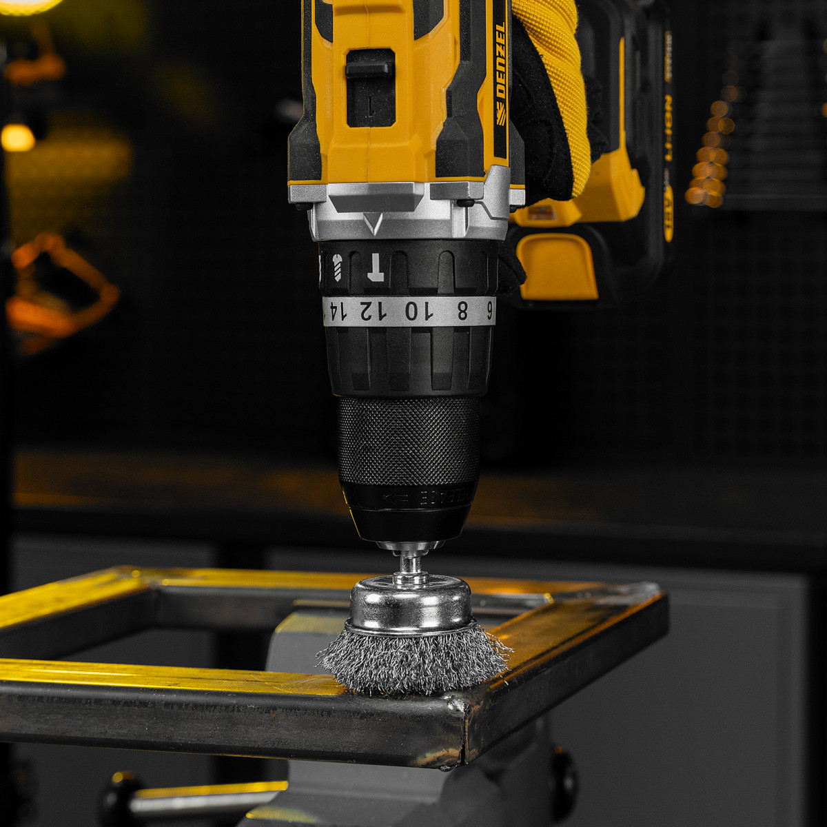 Набор щеток для дрели, 1 Плоская 50мм, 2 Чашки 25-50мм, шпилька, нерж. вит. проволока Denzel