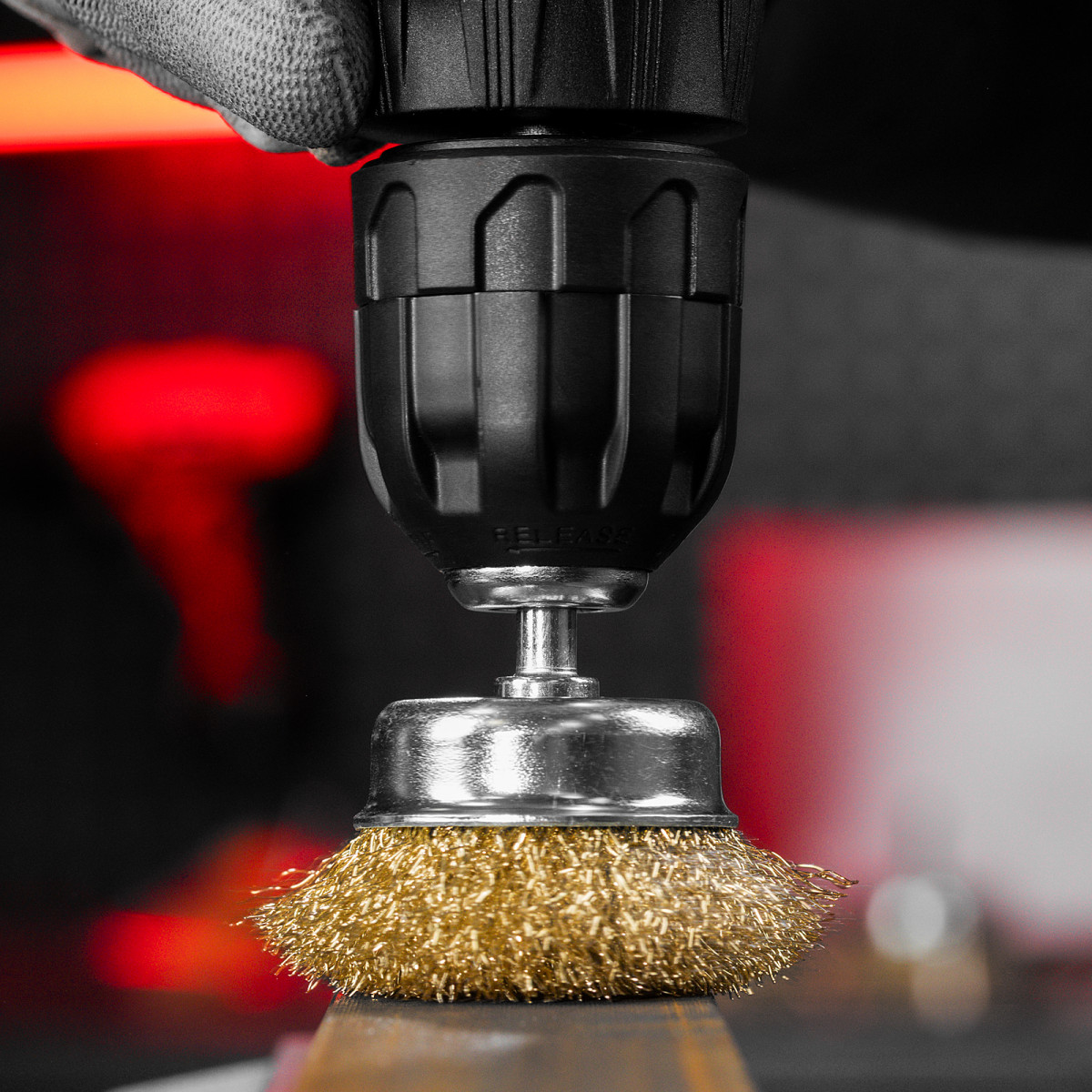 Набор Matrix 74484 состоит из 3 щеток: плоской диаметром 65 мм, «чашки» диаметром 50 мм со шпильками диаметром 6 мм для дрели, а также ручной металлической. Они эффективно удаляют тонкий слой ржавчины, краски, лака, а также убирают загрязнения. Насадкой в форме чашки удобно обрабатывать ровные поверхности, а плоской — работать в пазах и углах. Рекомендовано использование инструмента со скоростью вращения шпинделя до 4500 об/мин. Ручная щетка пригодится для обработки небольших площадей, когда применение электроинструментов нецелесообразно.