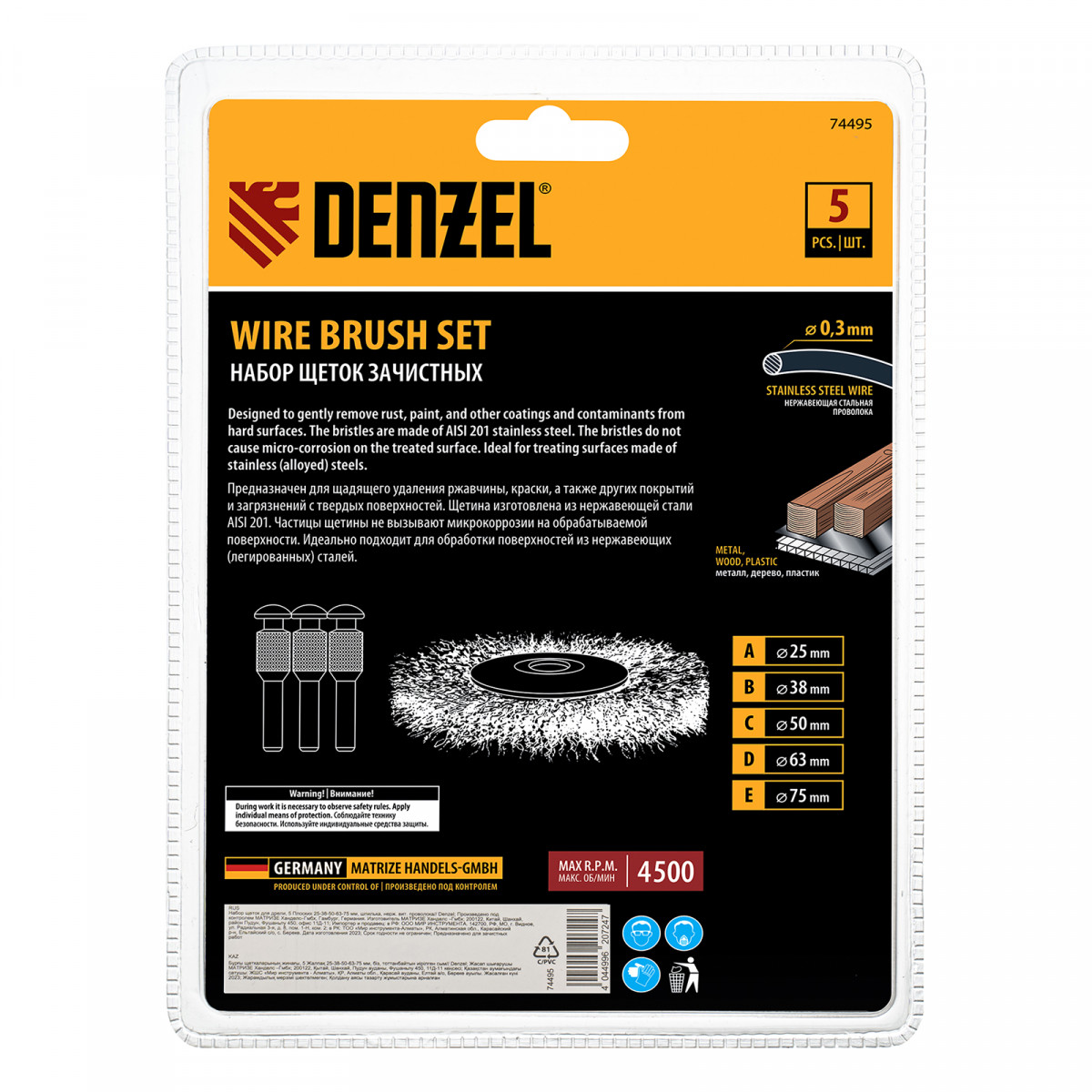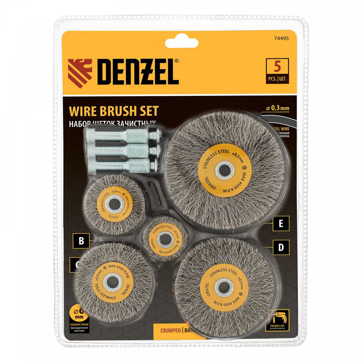 Набор щеток для дрели, 5 Плоских 25-38-50-63-75 мм, шпилька, нерж. вит. проволока Denzel