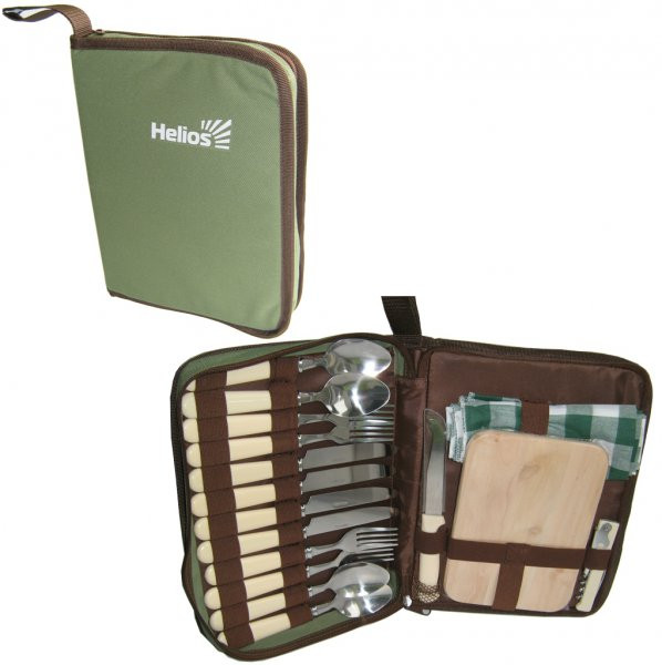Набор столовых принадлежностей для пикника в удобной сумке-планшете на 4 персоны включает 4 ложки, 4 вилки, 4 ножа, 1 нож для сыра, 1 штопор-открывалка, 1 доска разделочная. Материал сумки - Полиэстер 600D. Размер: 29 х 22 х 4 см. Вес - 1,1 кг.