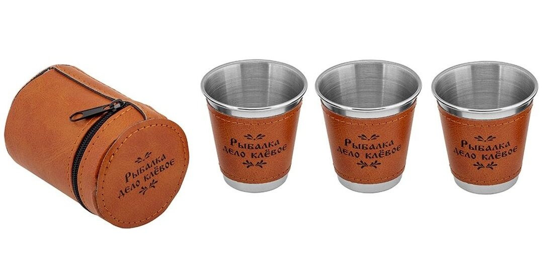 Компактный набор стопок с кожаным чехлом для удобства хранения и транспортировки.
