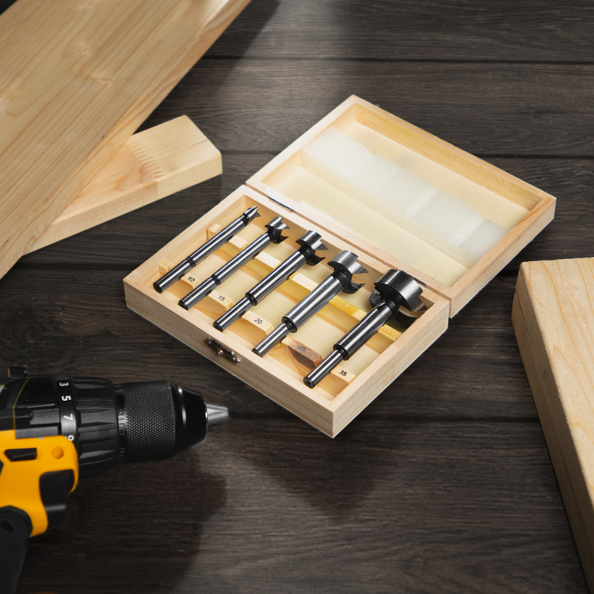 Набор сверл Форстнера по дереву, 10-15-20-25-35 мм, 5 шт, в деревянном боксе, цилиндрический хвостовик Sparta