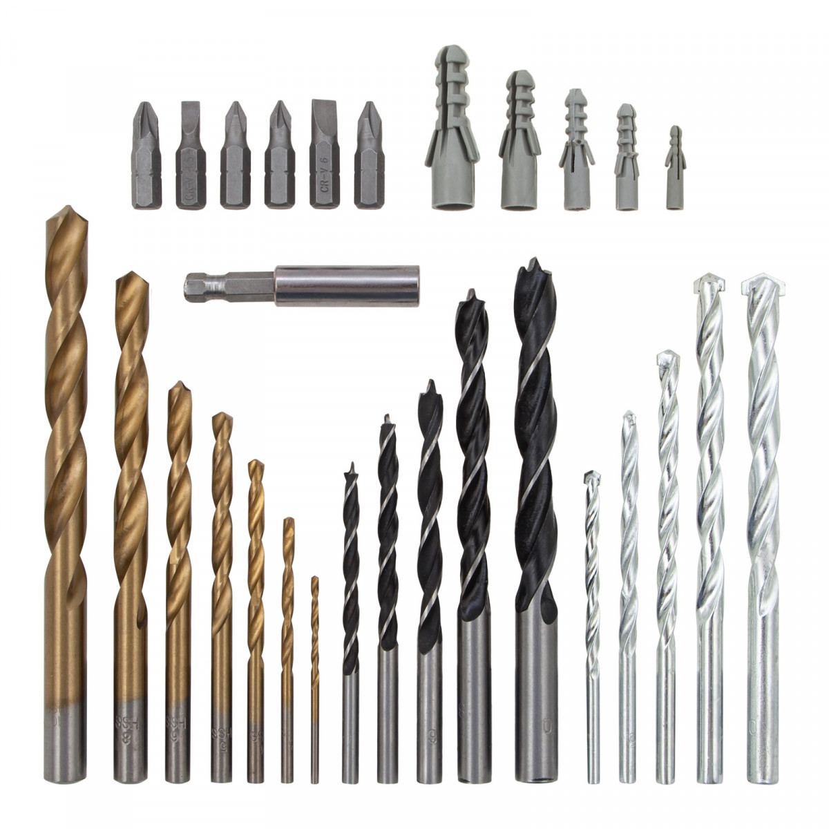 - Прочность и долговечность — биты выполнены из стали 45Х, сверла по дереву — из углеродистой стали, а сверла по металлу — из быстрорежущей стали HSS.
