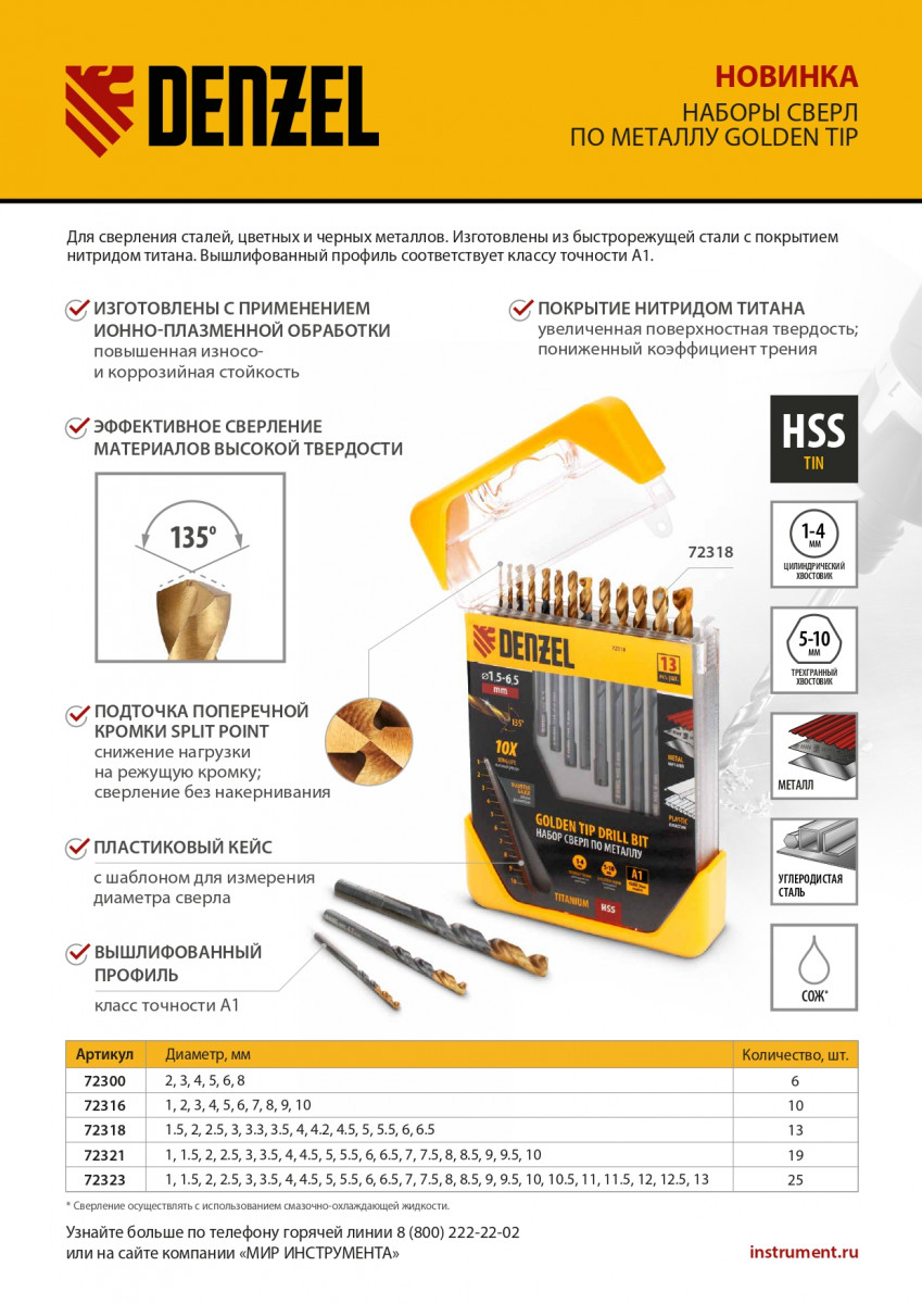 Набор Denzel Golden Tip 72316 включает 10 сверл по металлу из стали HSS-Tin, предназначенных для получения отверстий диаметром 1-10 мм в стальных заготовках. Оснастке присвоен класс точности A1: вышлифованные на высокоточном оборудовании профили имеют оптимальную геометрию, что позволяет получать идеально ровные отверстия. Сверла упакованы в пластиковый кейс, в крышке которого имеется шаблон для быстрого определения диаметра сверла. Набор будет полезен в быту и профессиональной сфере.