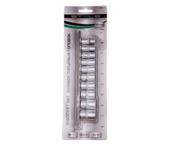 В набор входят 6-гранные торцевые головки на планке под квадрат 3/8" следующих размеров: 8 мм, 10 мм, 11 мм, 12 мм, 13 мм, 14 мм, 15 мм, 16 мм, 17 мм и 19 мм.