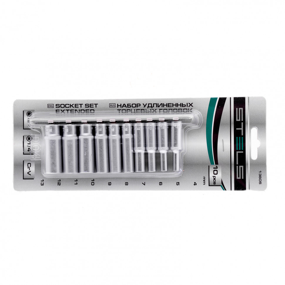 Набор удлиненных торцевых головок 1/4, шестигранные, CrV, 10 шт, 4-13 мм Stels