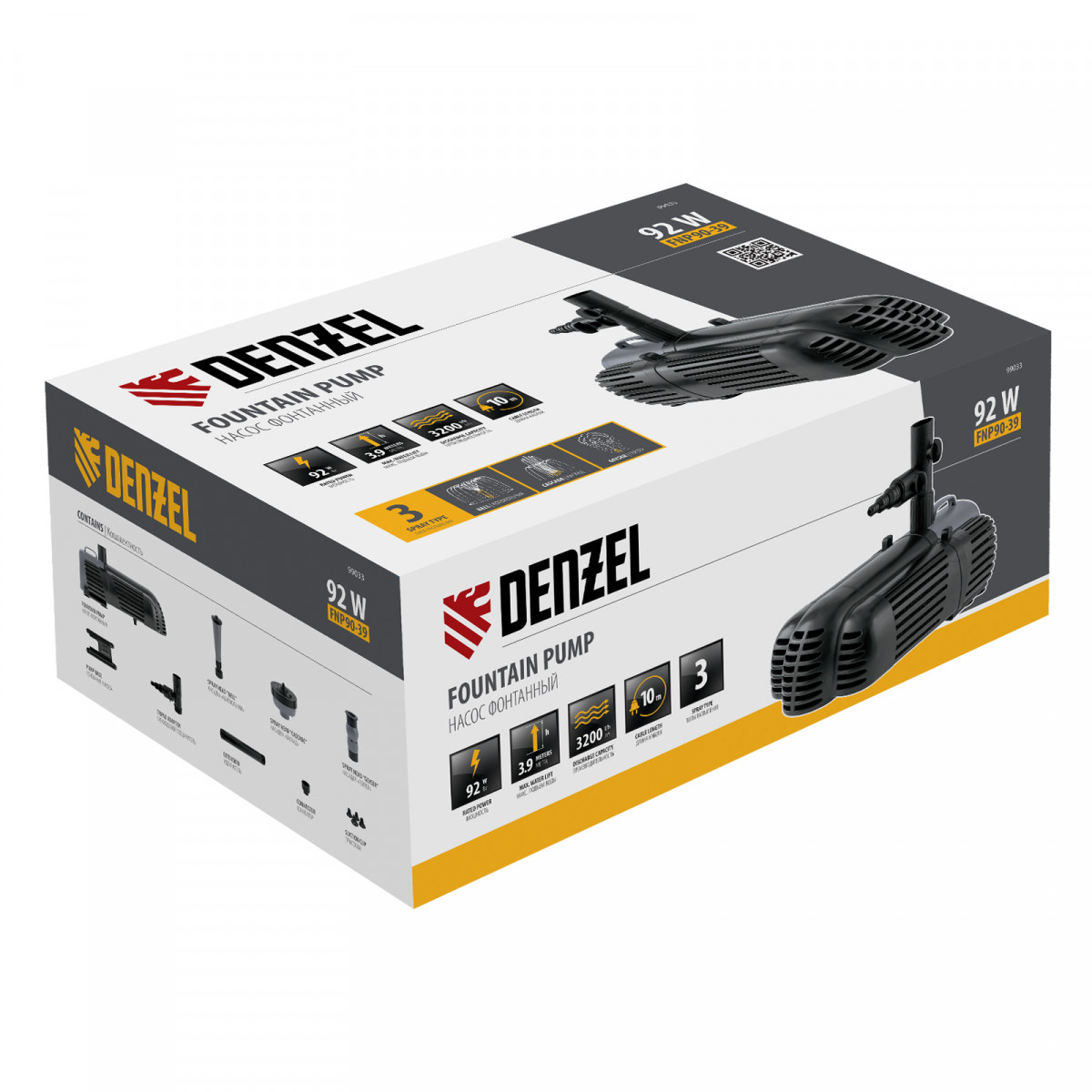 Насос фонтанный FNP90-39, 92 Вт, подъем 3,9 м, 3200 л/ч, колокольчик/каскад/гейзер Denzel