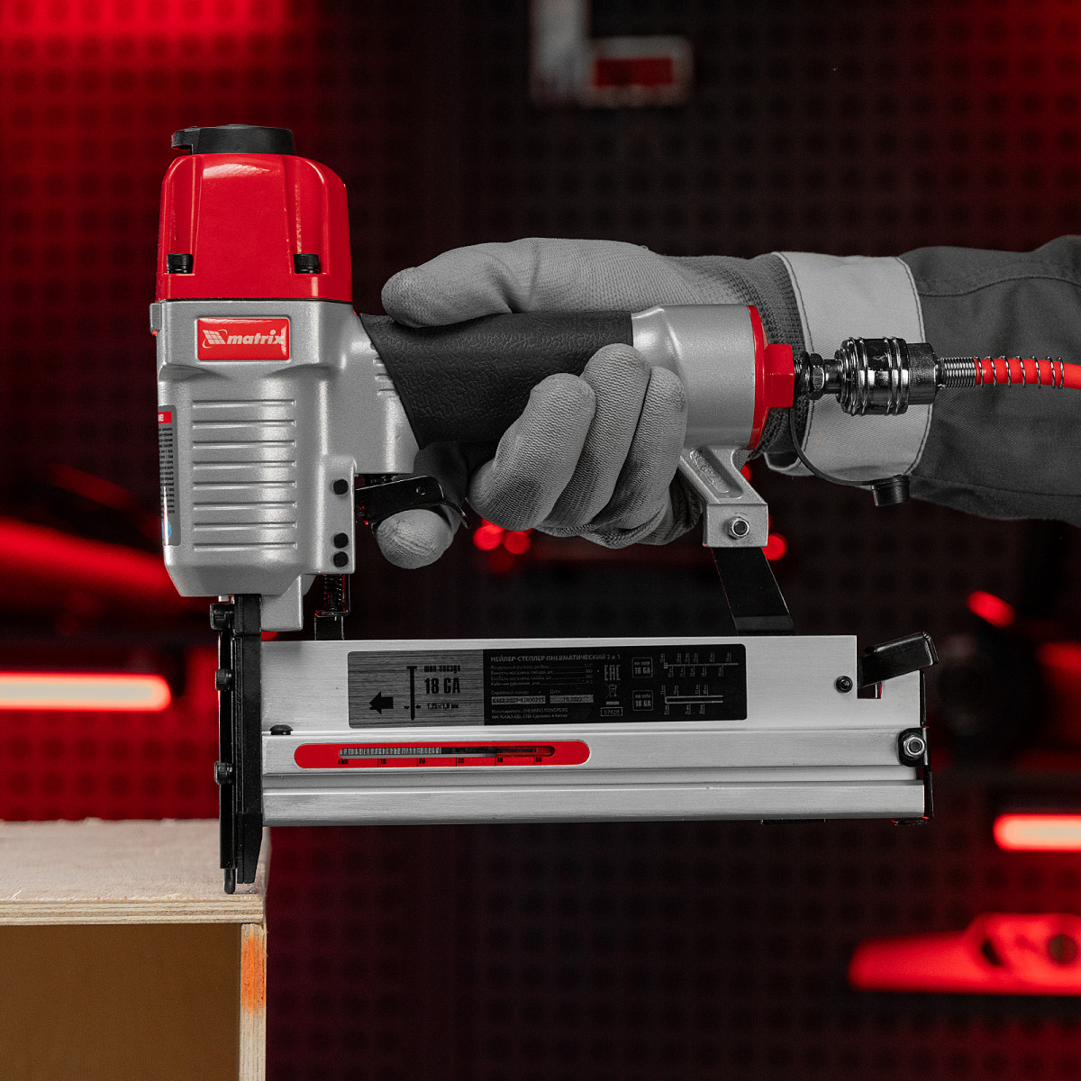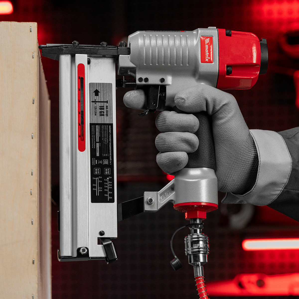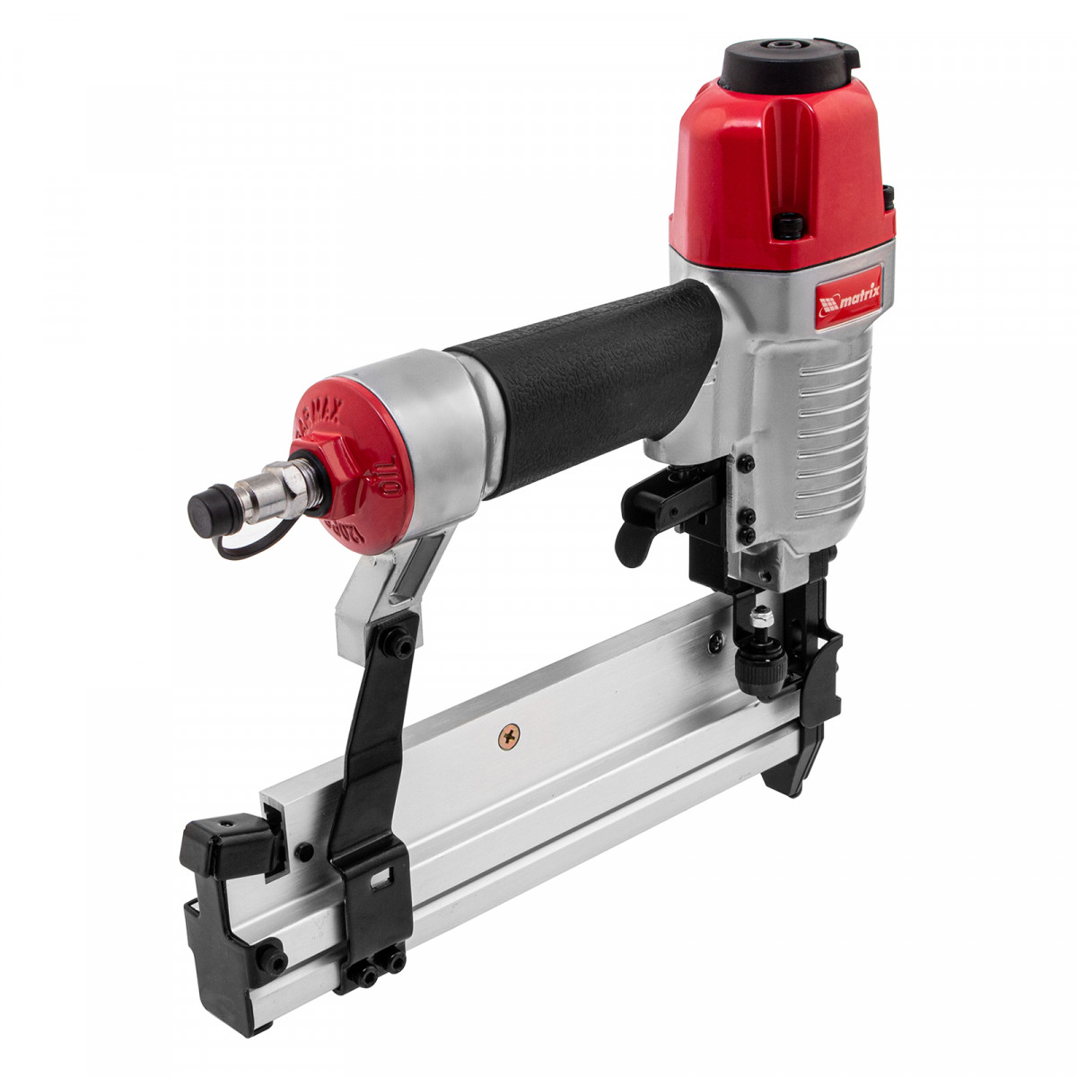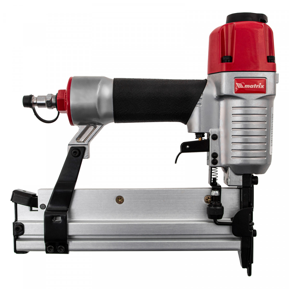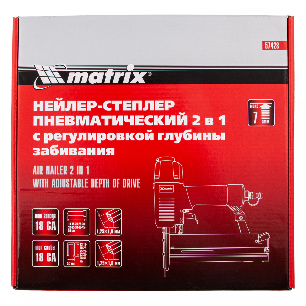 Пневматический нейлер-степлер Matrix 2 в 1 57428 с функцией регулировки глубины забивания предназначен для быстрого скрепления различных материалов гвоздями и скобами 18GA. Его используют для сборки мебели и деревянных каркасов, обшивки и утепления домов, монтажа окон, дверей, плинтусов или напольных покрытий. Нейлер-степлер подключается к любым типам компрессоров, т.к. расход воздуха составляет всего 0,7 л/мин.