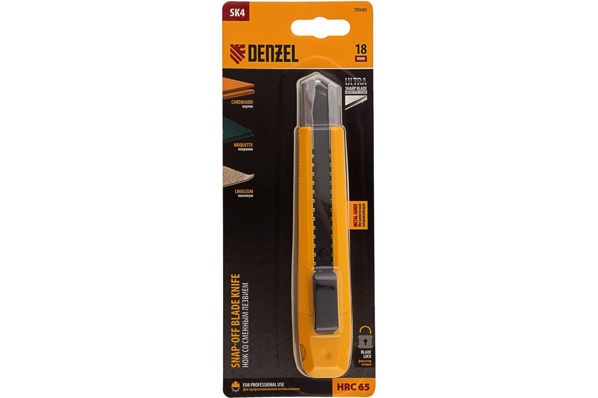 Нож 18 мм сменное лезвие SK4 метал направляющая клипса нажимной фиксатор Denzel