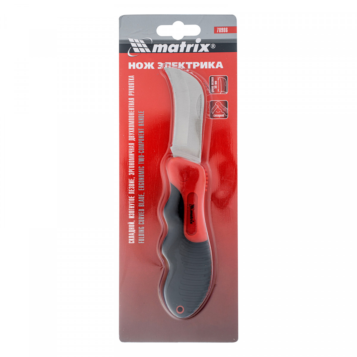 Нож электрика, складной, изогнутое лезвие, эргономичная двухкомпонентная рукоятка Matrix