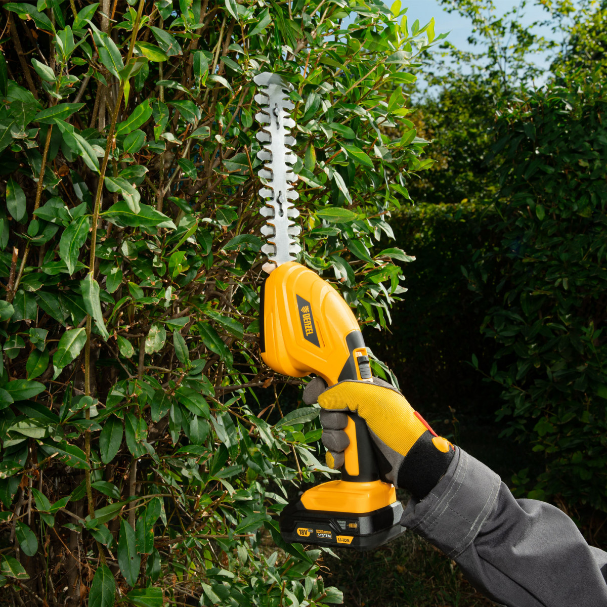 • Полный комплект поставки — аккумулятор и зарядное устройство прилагаются к ножницам-кусторезу.