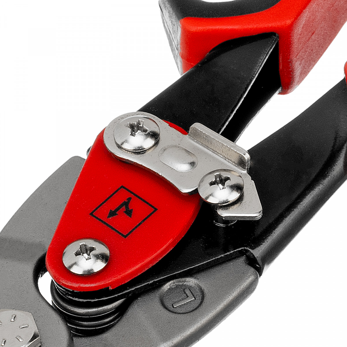 • Удобное хранение и транспортировка — блокировочный замок не дает ножницам раскрыться, на рукоятке имеется петля для подвешивания инструмента.