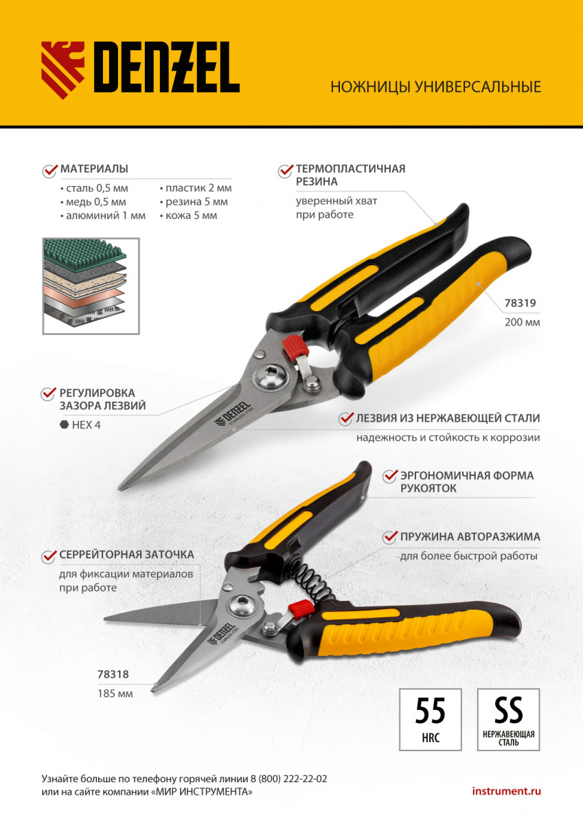 Универсальные ножницы Denzel 78318 длиной 185 мм — инструмент для разрезания тонкого металла и мягких материалов. Одно из лезвий имеет серрейторную (зубчатую) заточку, поэтому разрезаемый материал не выскальзывает из инструмента. Ножницы подходят для выполнения разнообразных работ: на даче помогут разрезать стальную сетку с небольшим диаметром проволоки, в походе — ветки или рыбу, во время мелкого ремонта или занятий творчеством — провода, кожу, резину, картон, бумажную лозу и другие материалы.