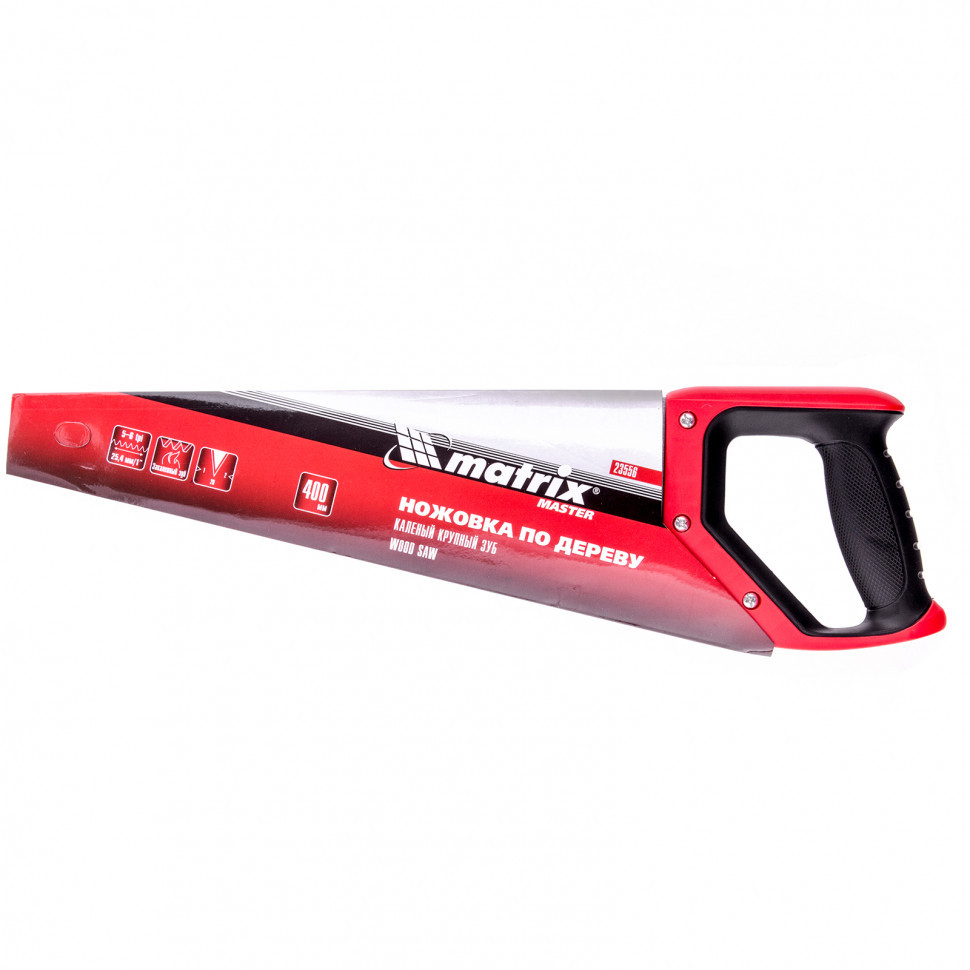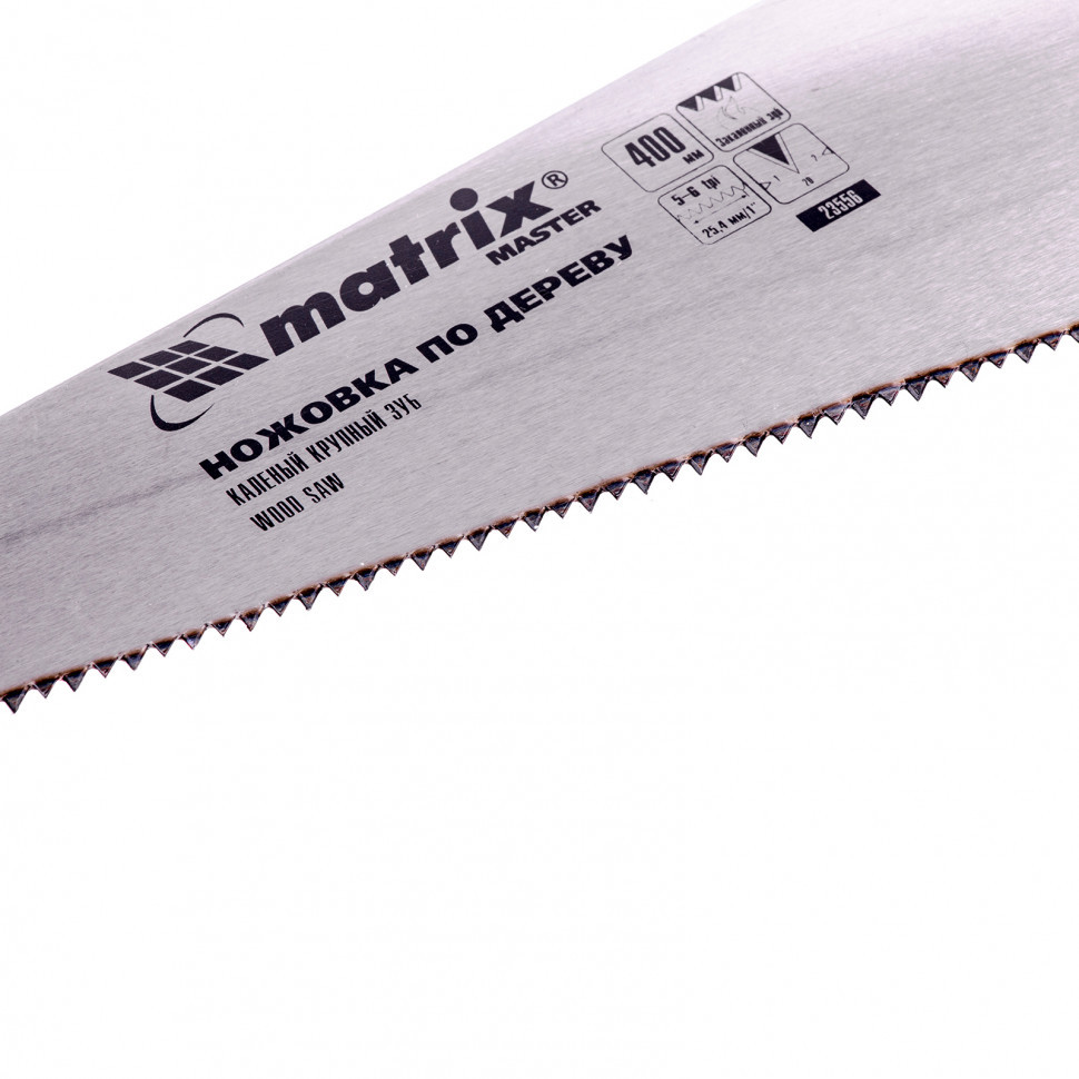 Ножовка по дереву Matrix 23556 с полотном длиной 400 мм, с крупными калеными зубьями с шагом 5-6 TPI и 2D-заточкой, с двухкомпонентной рукояткой, используется для быстрой продольной или поперечной распиловки древесины. Высокая скорость работы достигается благодаря крупным зубьям с волновой заточкой и универсальным шагом 4-5 мм. Двухгранная заточка зубьев дает возможность пилить в направлении как от себя, так и на себя, а также перетачивать режущую кромку при необходимости. Ножовка подходит для выполнения плотницких и хозяйственных работ.