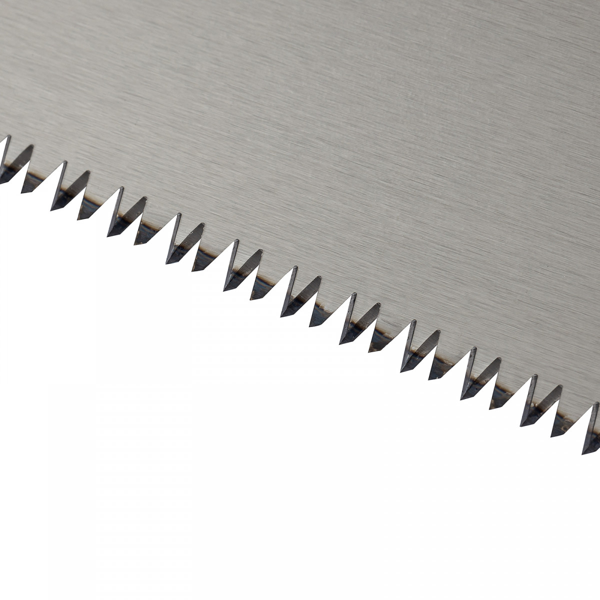 Ножовка по дереву Denzel 24141 длиной 450 мм, с зубьями с шагом 11 TPI и 3D-заточкой, с металлопластиковой рукояткой, предназначена для продольной и поперечной распиловки заготовок из древесины, ДСП, ДВП, МДФ, ламината, а также из ПВХ (труб, панелей, коробов). Подходит для распиливания плинтусов, вагонки, деревянных профиле й. Мелкие зубья с шагом 11 TPI позволяют выполнять точный и чистый рез. Ножовка используется для проведения столярных работ в мастерской и на дачном участке.