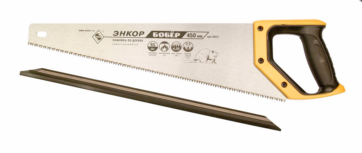 Ножовка с закаленным зубом Энкор Бобер 9852 предназначена для пиления заготовок из древесины. Полотно выполнено из стали 65 Mn с заточенными под двумя углами зубьями. Пластиковая рукоятка частично обрезинена для надежного хвата и удобства при работе. Зубья высотой 3.5 мм разведены, что обеспечивает гладкость реза.