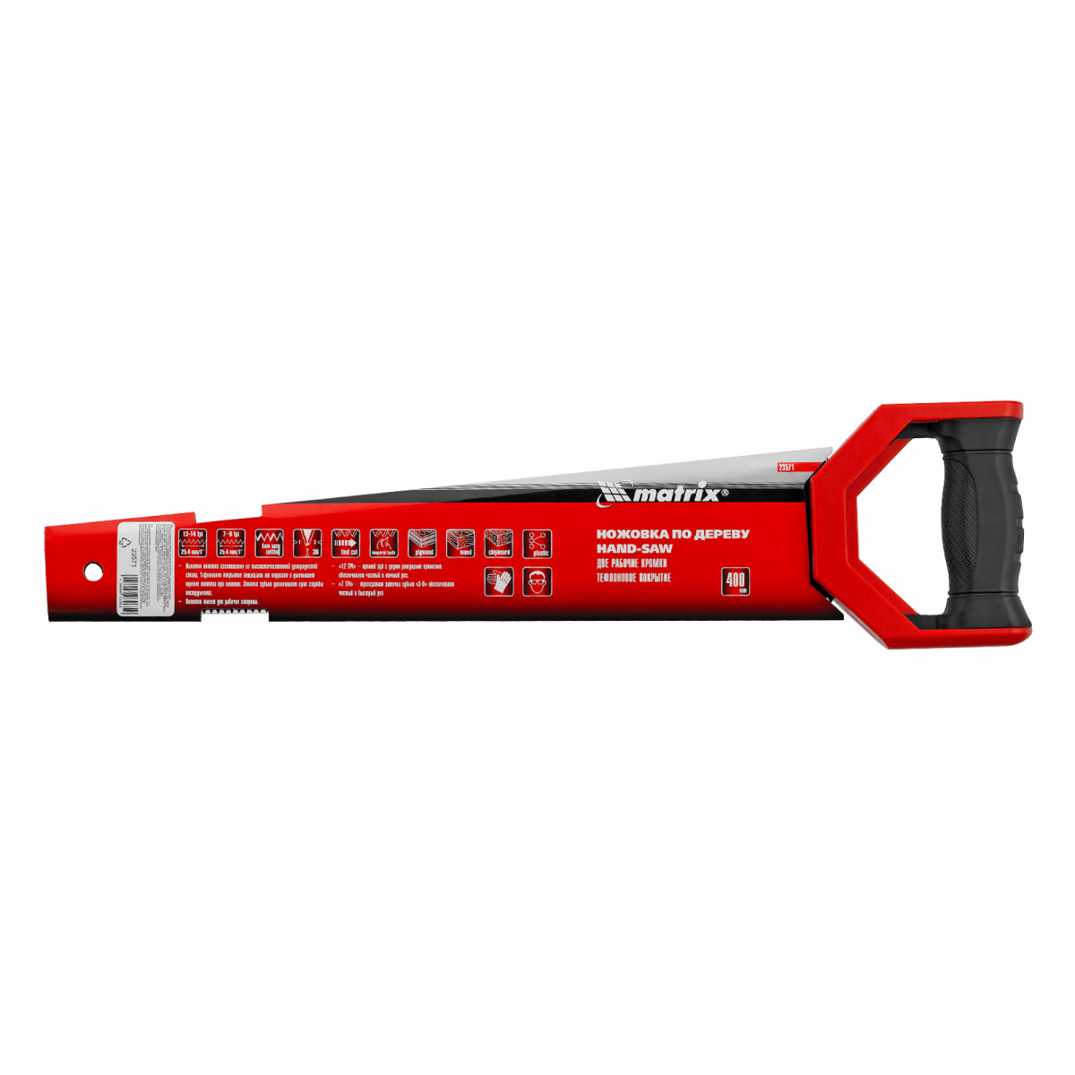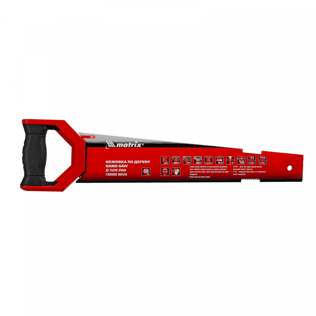 Ножовка по дереву Matrix UNIVERSAL 23571 с полотном длиной 400 мм и закаленными зубьями c заточкой 3D и 2D имеет две рабочие кромки с шагом зубьев 13-14 TPI и 7-8 TPI. Может применяться для выполнения столярных и плотницких работ разной степени точности. Мелкие зубья с 2D-заточкой обеспечивают ровный и точный рез в направлении от себя и к себе. Режущая кромка с шагом зубьев 7-8 TPI и с 3D-заточкой используется для быстрой и чистой распиловки. Ножовкой можно пилить древесину, фанеру, ДСП.