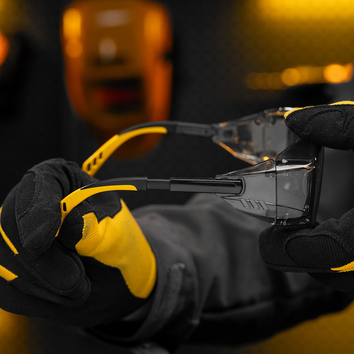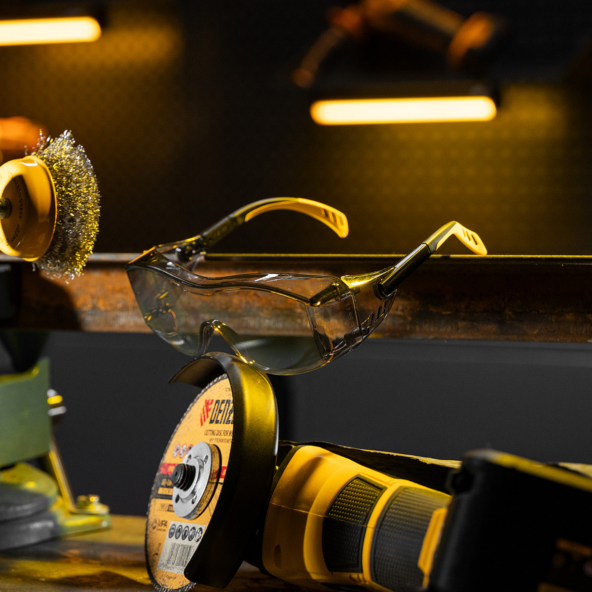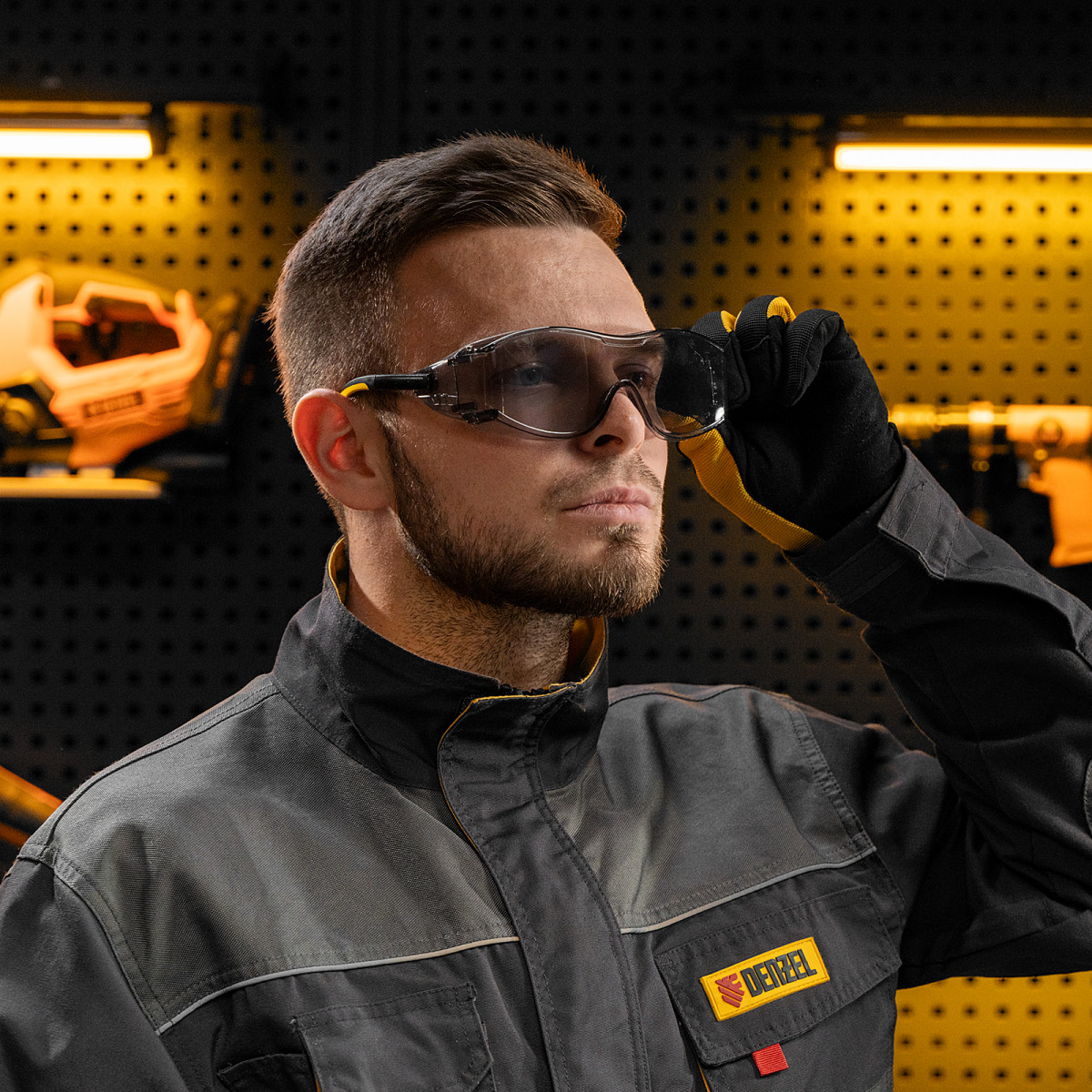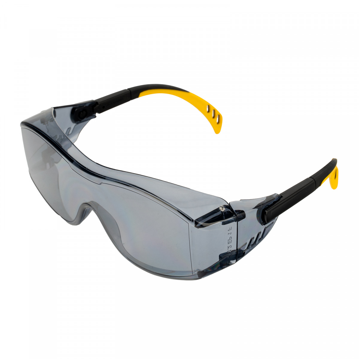 • Продуманная конструкция — особая форма линз обеспечивает боковую и надбровную защиту, а также позволяет носить защитные очки вместе с коррригирующими.