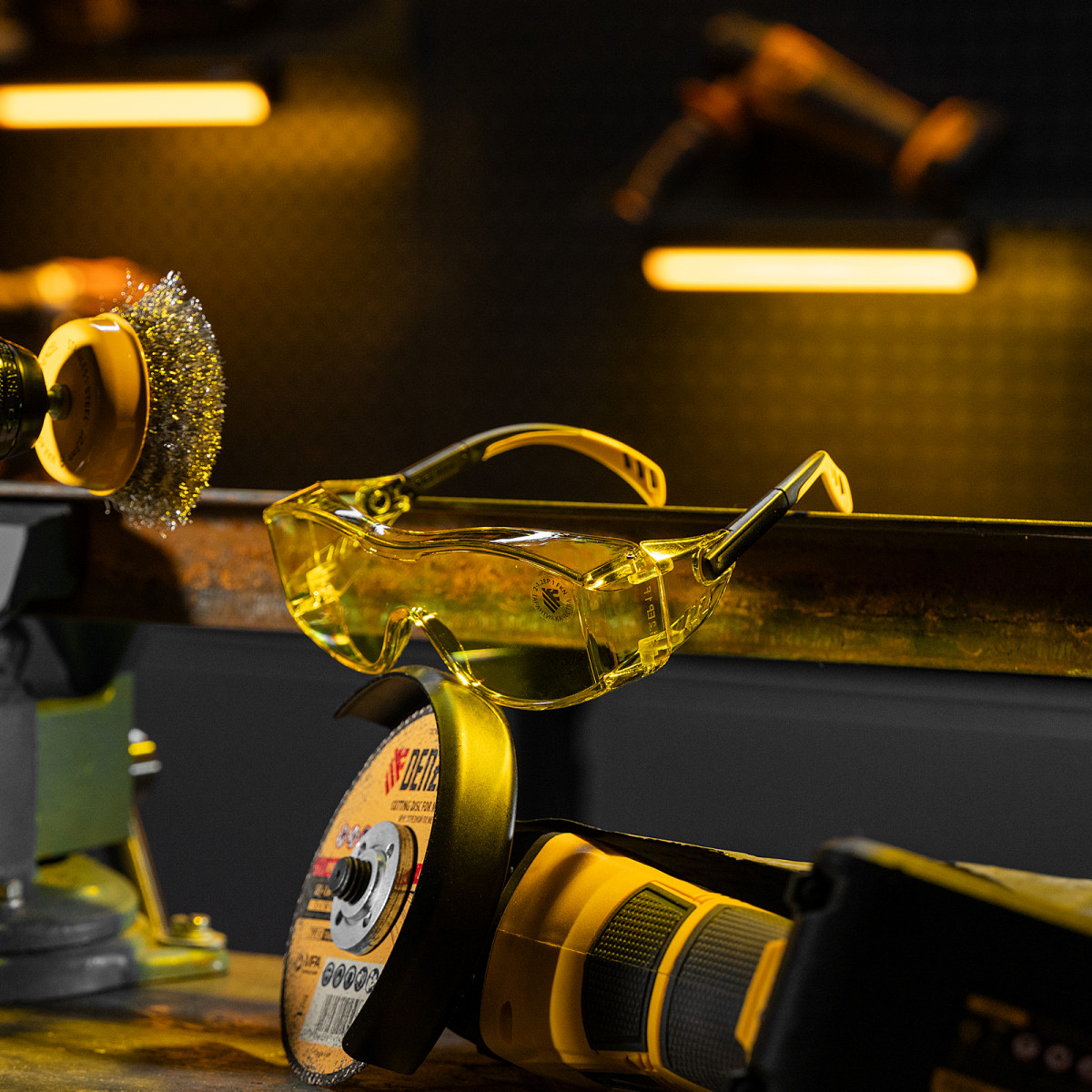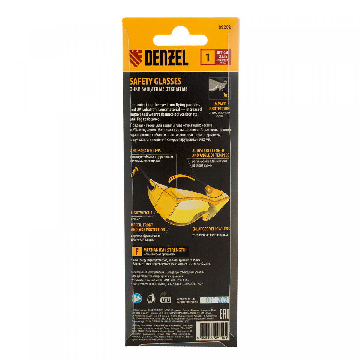 Очки защитные открытые Denzel 89202 с увеличенными поликарбонатными желтыми линзами предназначены для защиты глаз от механических повреждений и УФ-излучения. Очкам присвоен класс механической прочности F, они обеспечивают защиту от высокоскоростных частиц с низкоэнергетическим ударом (скорость частиц до 45 м/с). Легкие универсальные очки используются во время работы с электро- и бензоинструментом, на производстве и в быту.