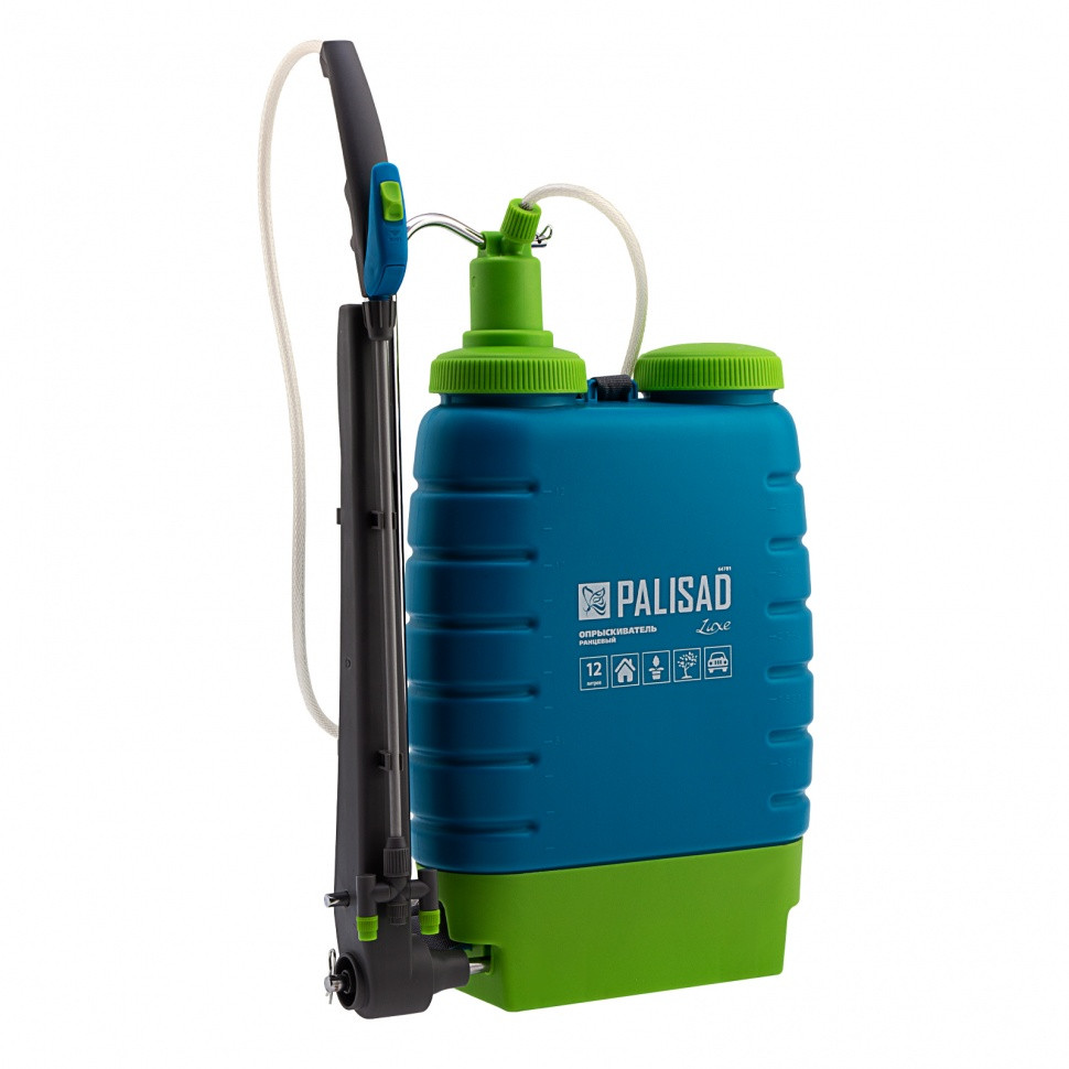 Ранцевый опрыскиватель вместимостью 12 л, с насосом, шлангом и разбрызгивателем, используется для обработки садовых растений пестицидами и для внесения удобрений. Может применяться в быту — например, для мытья автомашины или окон. Опрыскиватель устанавливают на горизонтальную поверхность или вешают за спину при помощи мягких лямок — это удобно при перемещении по большой территории. Бак вмещает 12 л, поэтому устройство долго работает без долива жидкости. Боковое расположение ручки насоса позволяет подкачивать давление в баке, не снимая опрыскиватель со спины.Преимущества