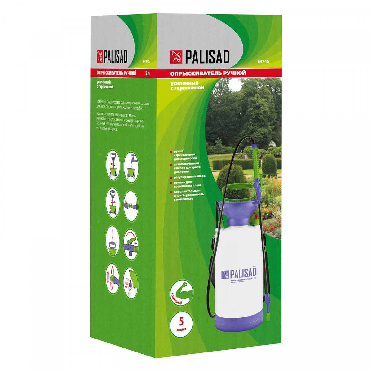 Ручной усиленный опрыскиватель Palisad 64745 вместительностью 5 л, с горловиной, насосом, шлангом и разбрызгивателем, используется для защиты садово-огородных культур от вредителей и болезней, а также для внесения удобрений. Предназначен для работы на дачном участке. Бак отличается повышенной прочностью за счет усиленных стенок и дна. Опрыскиватель можно повесить на плечо, освободив руки для более комфортной работы.
