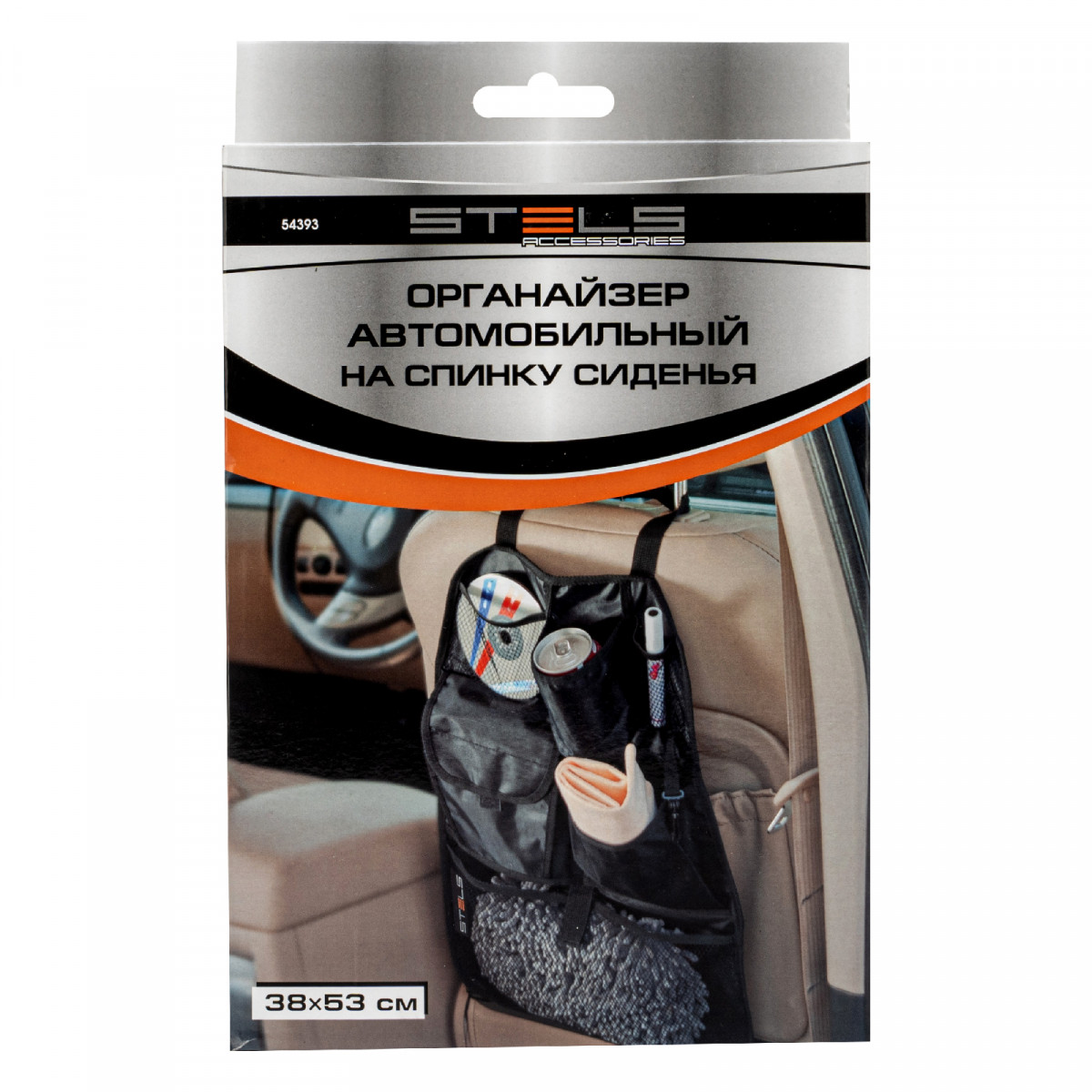Органайзер автомобильный Stels 54393 устанавливается на спинку переднего сиденья. Он оснащен большими и маленькими отделениями для размещения различных предметов: ручек, документов, журналов, телефона, бутылки с водой и т.д.