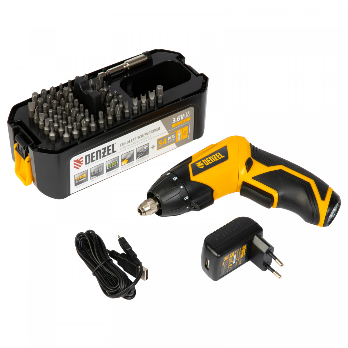 Отвертка аккумуляторная CSL-3.6-01, Li-Ion, 3.6 В, 1.3 А*ч, 200 об/мин, с аксессуарами Denzel