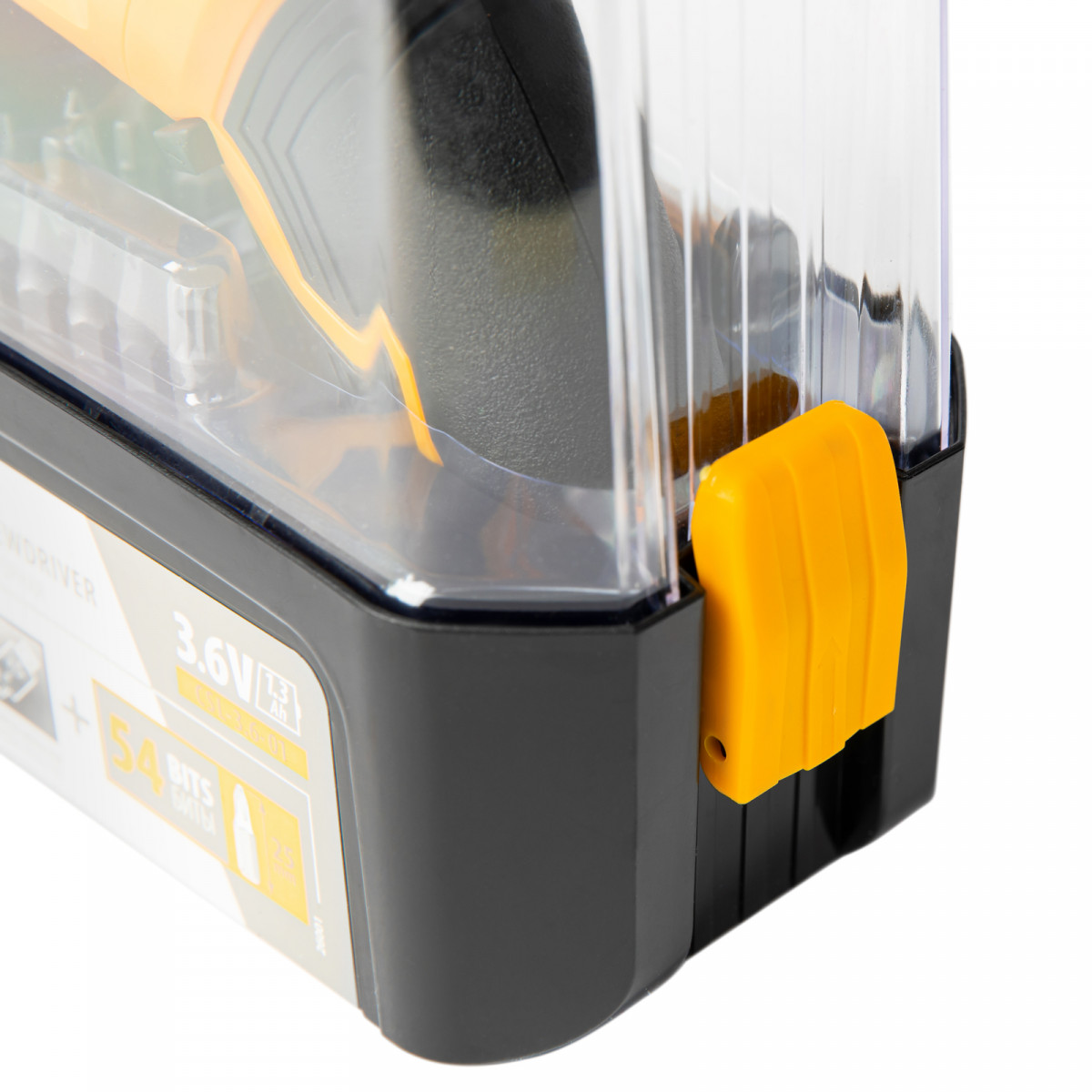 - Удобное хранение и транспортировка — отвертка с аксессуарами поставляется в пластиковом кейсе с прозрачной крышкой.