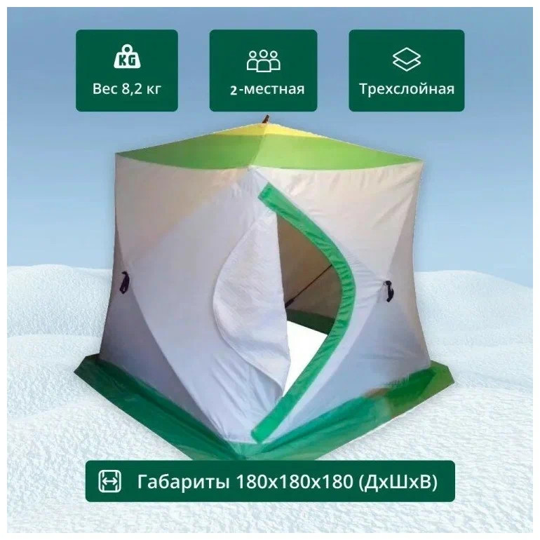 Вес, кг: 8,2 Количество мест: 2 Количество слоев палатки: 3 Материал: оксфорд 240PU + термостежка Размер, см: 180 х 180 х 180 Форма палатки: куб Каркас: Стеклопластик (стеклокомпозит) 9мм