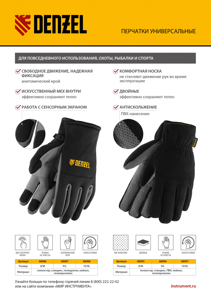 Универсальные перчатки Denzel 68086 размера 8, c искусственным мехом, предназначены для повседневного использования, а также будут полезны на охоте, рыбалке, во время занятий спортом. Подходят для работы с сенсорным экраном: специальные накладки на указательном и среднем пальцах позволяют пользоваться смартфоном, не снимая перчаток.