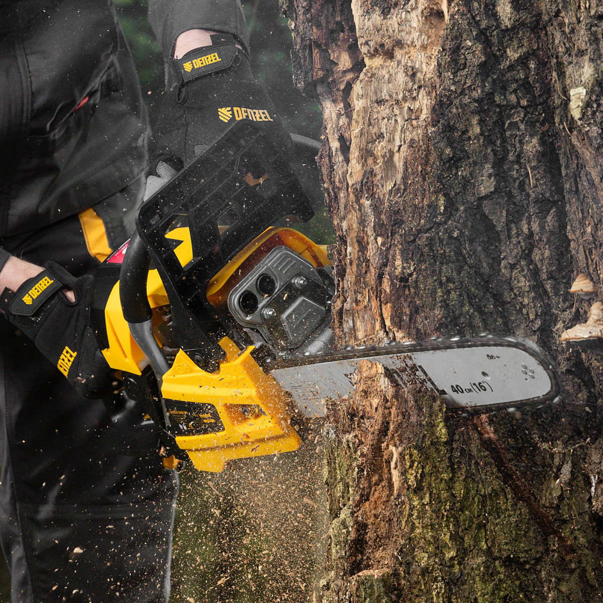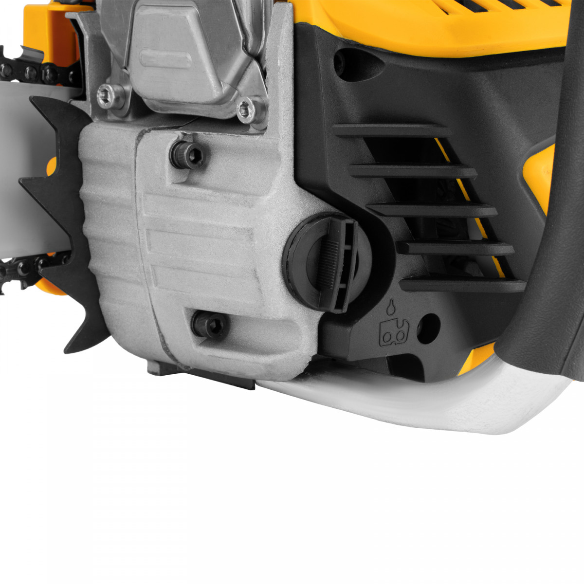 • Безопасная работа — блокировка от случайного запуска и моментальное срабатывание тормоза цепи при отскоке пилы снижают вероятность получения травм.