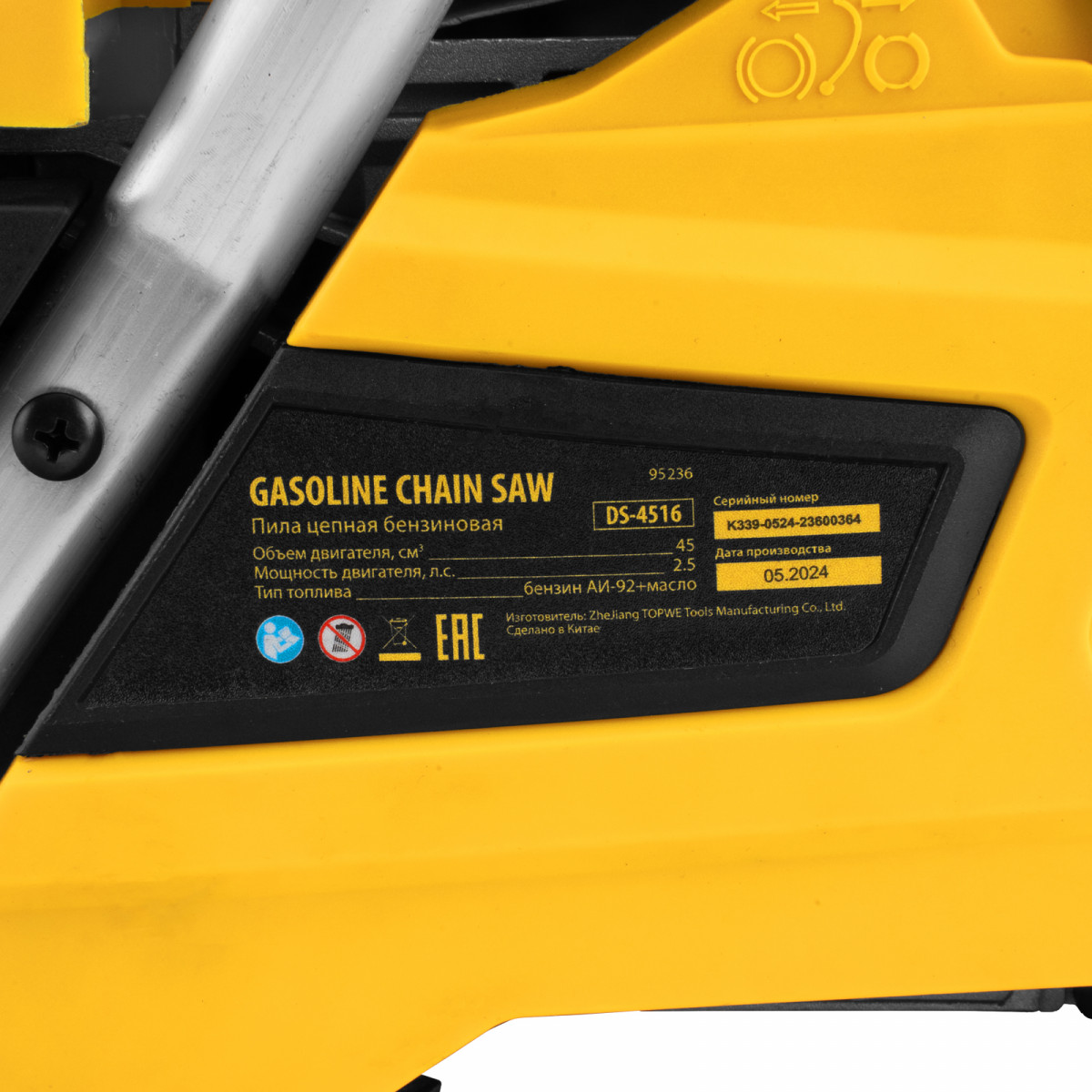 Пила цепная бензиновая Denzel DS-4516 95236 мощностью 2,5 л.с. оснащена двигателем объемом 45 см3 и поставляется с высокопроизводительной пильной гарнитурой: шиной длиной 40 см, цепью с 64 звеньями шагом 0,325" и пазом 1,5 мм. Используется для заготовки дров, распиловки древесины, при проведении ремонтных, строительных и садовых работ. Мощный и экономичный двухтактный двигатель позволяет эффективно и быстро решать поставленные задачи.