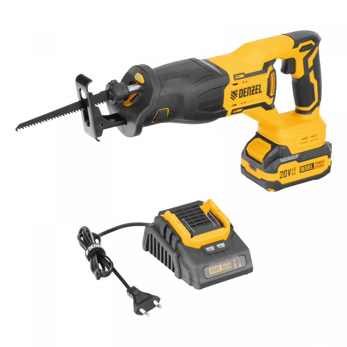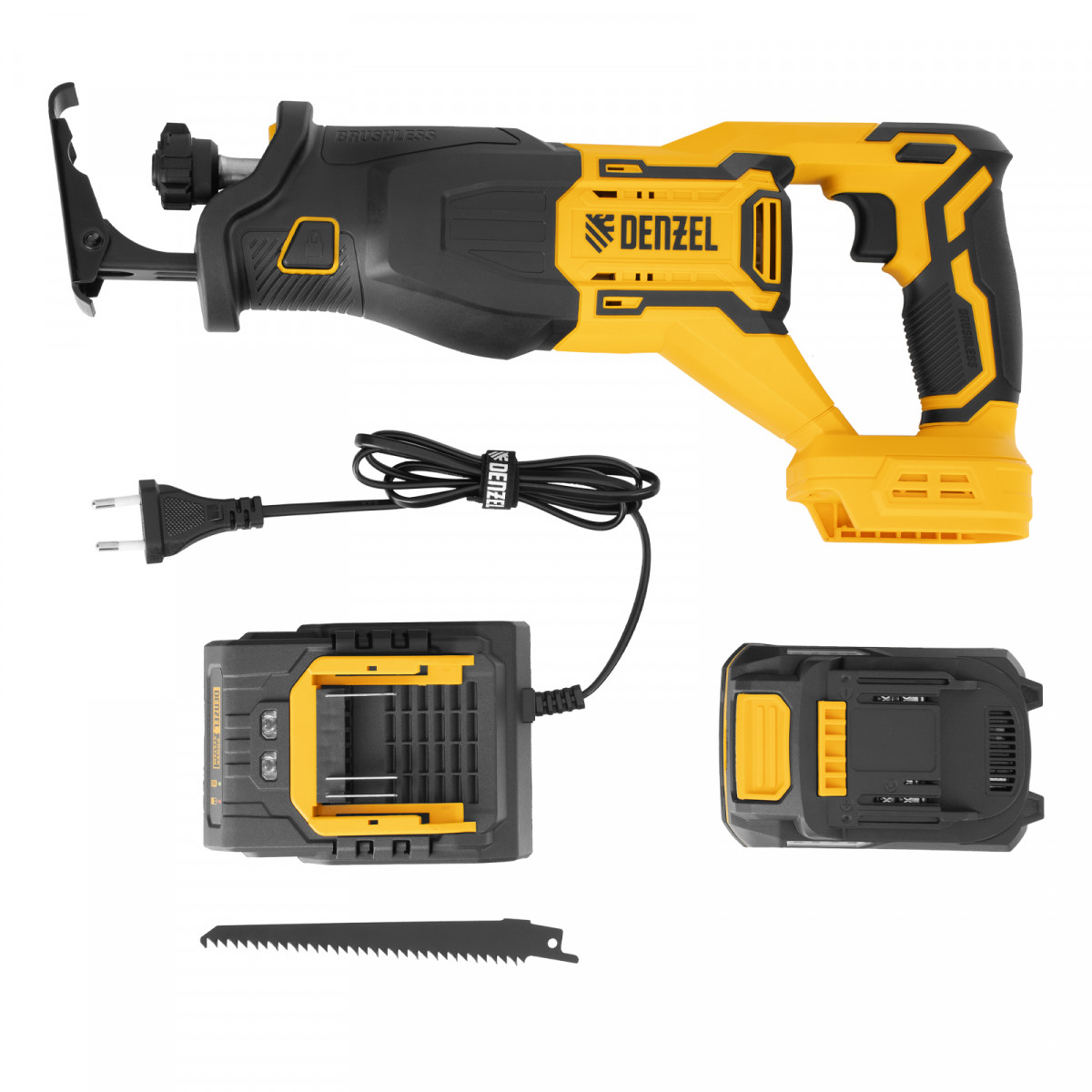 Пила сабельная аккумуляторная - 1 штЛезвие сабельной пилы - 1 штАккумуляторная батарея Denzel Power System - 1 штЗарядное устройство -1 штПолотно пильное по дереву - 1 штПолотно пильное по металлу - 1 штРуководство по эксплуатации с гарантийным талоном - 1 шт
