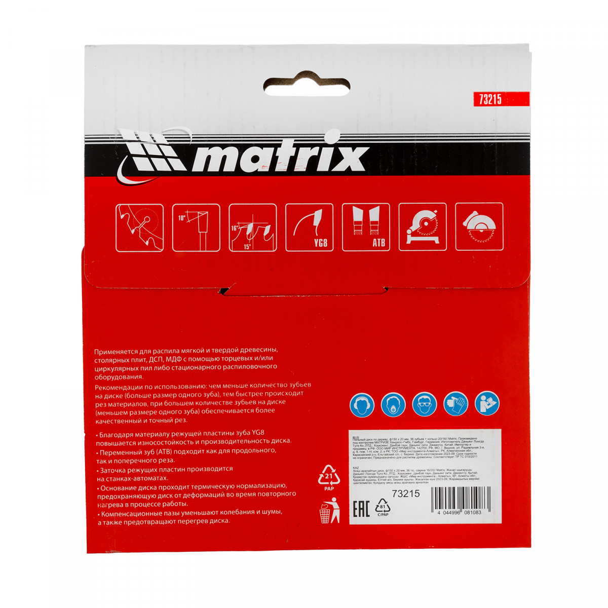 Пильный диск по дереву Matrix 73215 диаметром 150 х 20 мм, с 36 зубьями и переходным кольцом 20/16, — оснастка для циркулярных и торцовочных пил с соответствующим посадочным и внешним диаметром. Используется для продольного/поперечного реза материалов из мягкой и твердой древесины, ДСП, ДВП, фанеры, столярных плит. В комплект поставки входит переходное кольцо 20/16, позволяющее самостоятельно изменить посадочный диаметр при необходимости. Диск подходит для бытового и профессионального применения.