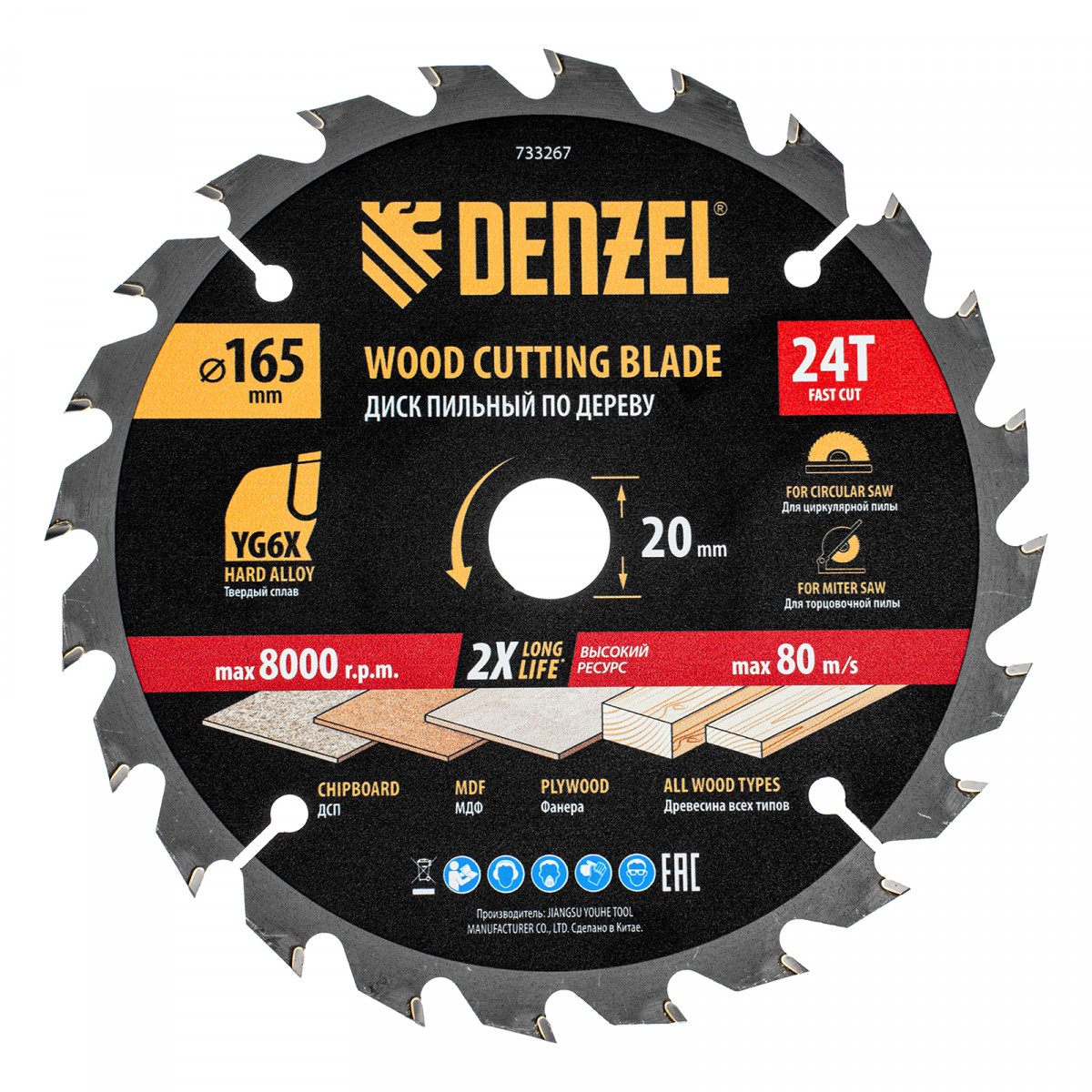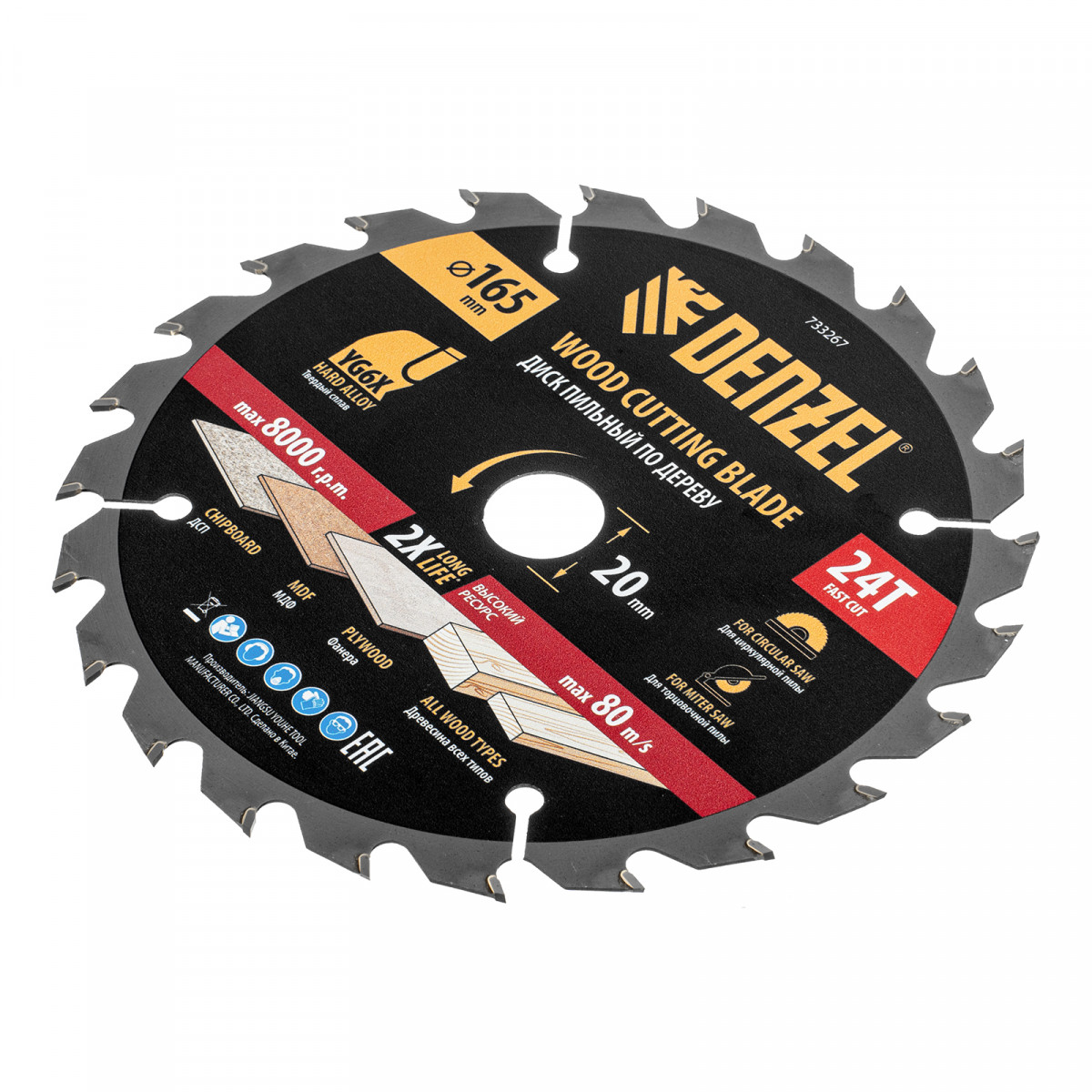 Тонкий пильный диск Denzel 733267 диаметром 165 x 20 мм, с 24 зубьями, устанавливается на циркулярную, торцовочную пилу или распиловочный станок и предназначен для выполнения работ по дереву. Подходит для быстрого реза древесины любого типа, а также фанеры, ДСП, МДФ. Крупные зубья типа ATB обеспечивают высокую скорость как продольного, так и поперечного распила. Толщина диска уменьшена, что повышает производительность и снижает нагрузку на инструмент. На зубья напаяны твердосплавные пластины, длительное время сохраняющие режущую способность. Пластины из твердого сплава YG6X прошли многоступенчатую заточку, что позволило достичь оптимальной геометрии и максимальной эффективности распиловки.