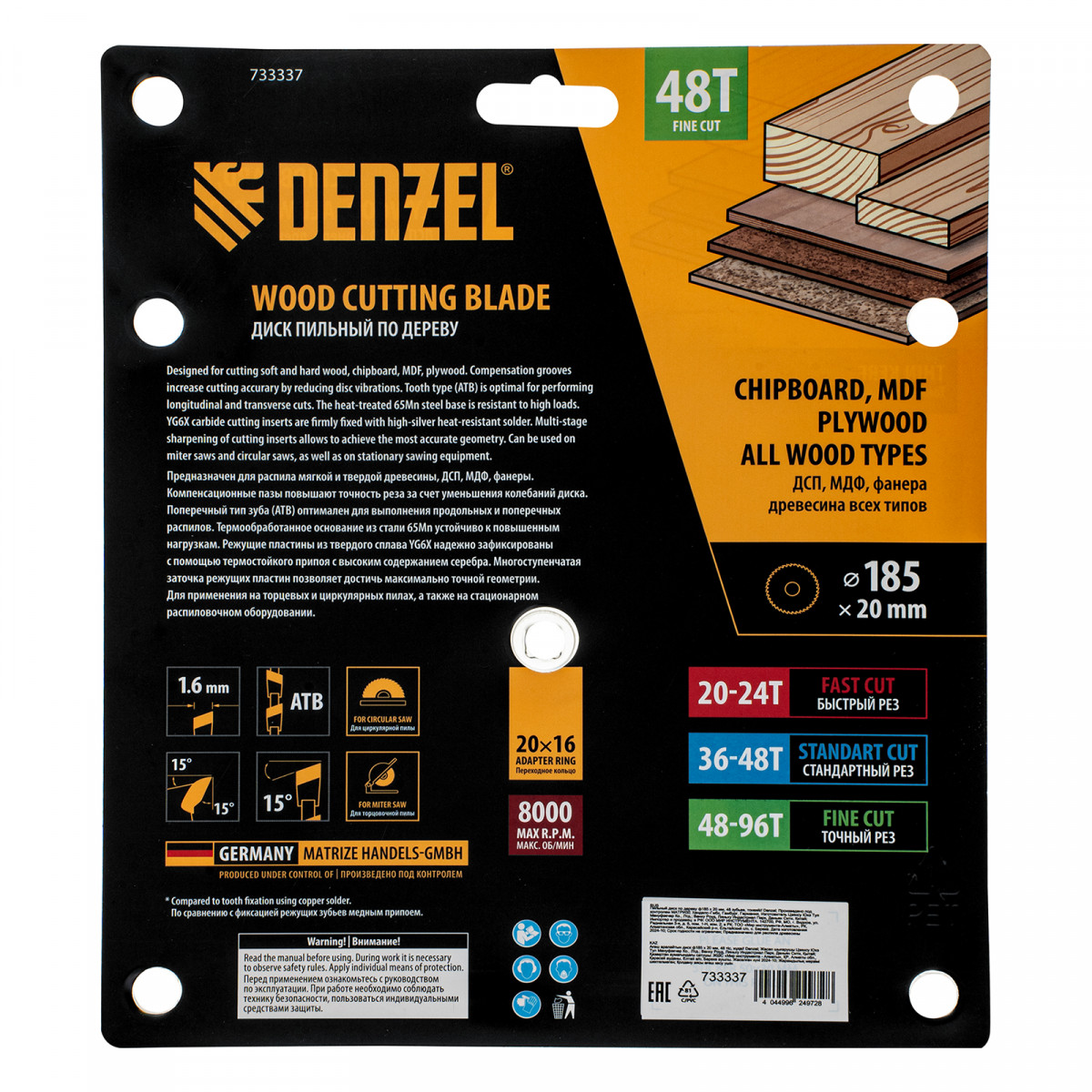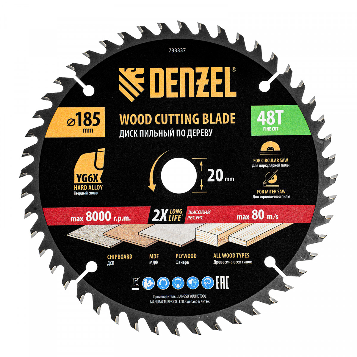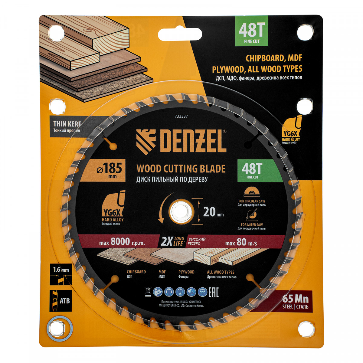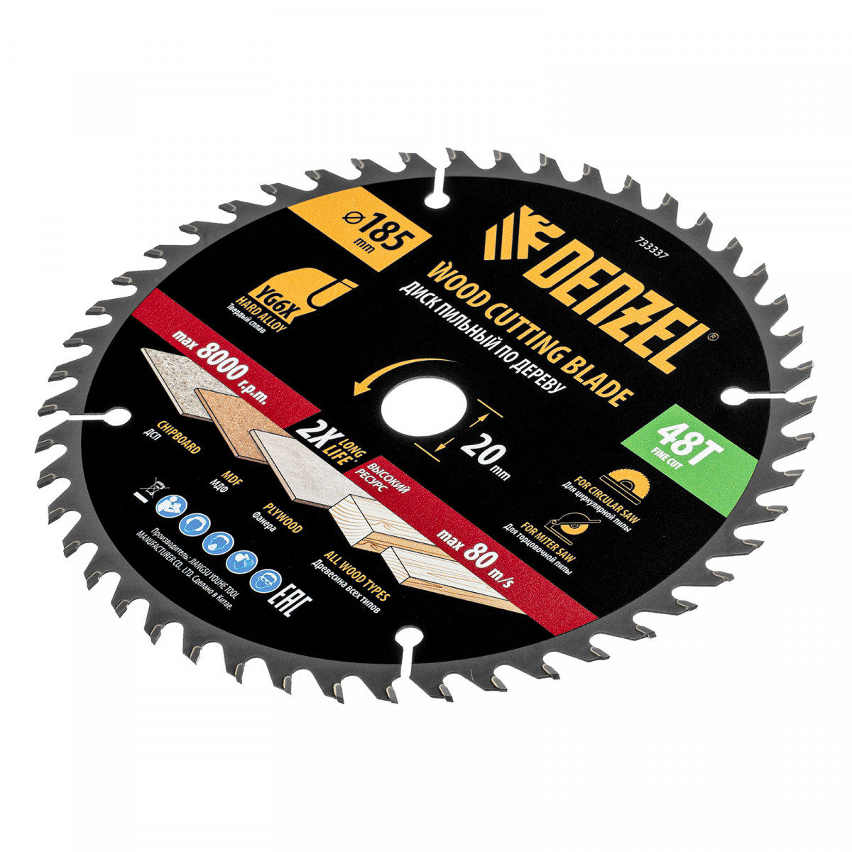 Тонкий пильный диск Denzel 733337 диаметром 185 x 20 мм, с 48 зубьями, устанавливается на циркулярную, торцовочную пилу или распиловочный станок и предназначен для выполнения работ по дереву. Подходит для распиливания древесины любого типа, а также фанеры, ДСП, МДФ. Зубья типа ATB обеспечивают высокое качество и скорость как продольного, так и поперечного распила. Тип реза — стандартный. Толщина диска уменьшена, что повышает производительность и снижает нагрузку на инструмент. На зубья напаяны твердосплавные пластины, длительное время сохраняющие режущую способность. Пластины из твердого сплава YG6X прошли многоступенчатую заточку, что позволило достичь оптимальной геометрии и максимальной эффективности распиловки.