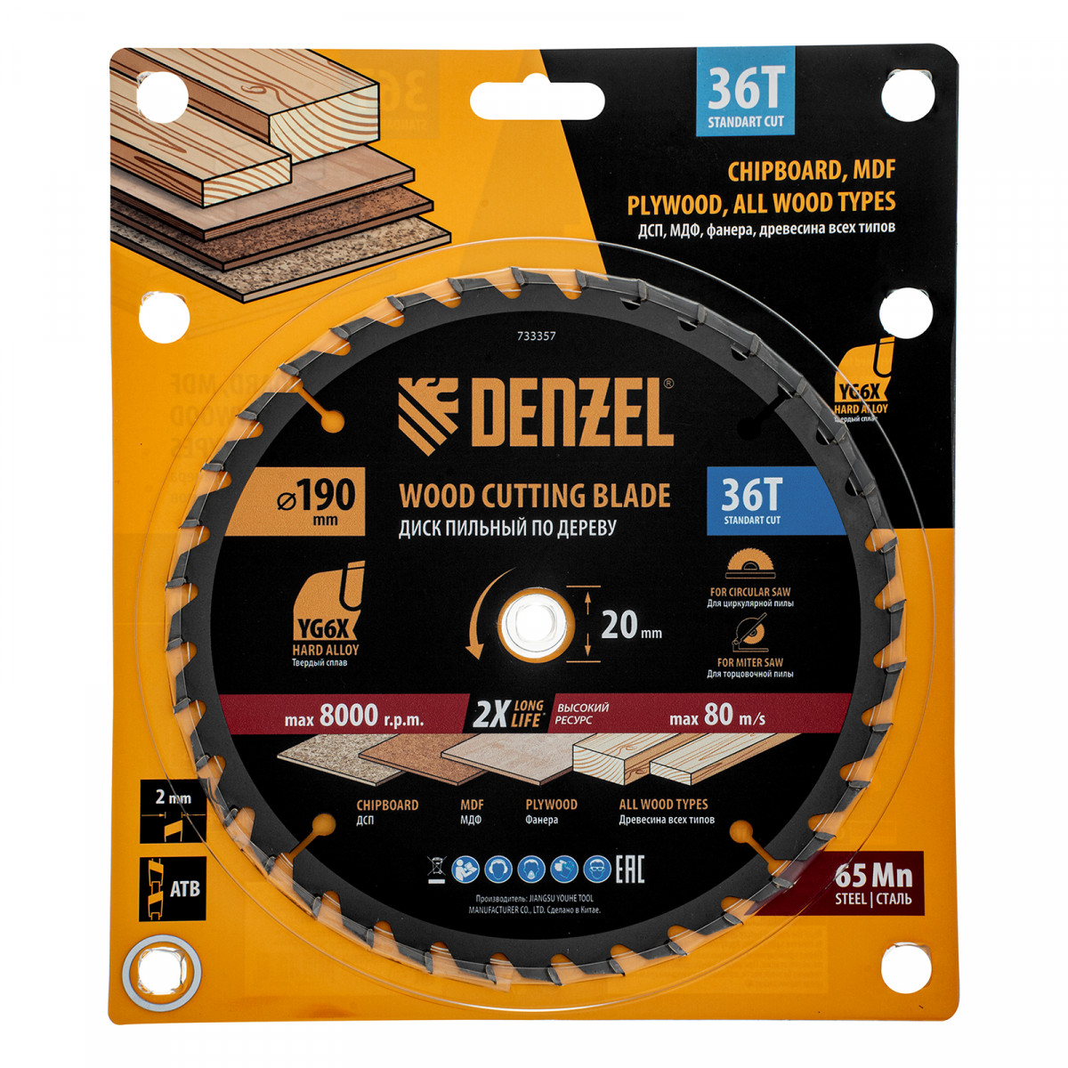Пильный диск Denzel 733357 диаметром 190 x 20 мм, с 36 зубьями, предназначен для продольного и поперечного распила твердой и мягкой древесины, фанеры, МДФ, ДСП. 36 зубьев типа ATB с режущими пластинами оптимальной геометрии обеспечивают качественный рез. Тип реза — стандартный. Режущие пластины из твердого сплава YG6X сохраняют рабочие свойства при интенсивном использовании. Диск устанавливается на циркулярную, торцовочную пилу или на распиловочный станок. В комплект поставки входит переходное кольцо с 20 на 16 мм, что позволяет изменить посадочный размер и расширяет возможности использования диска.