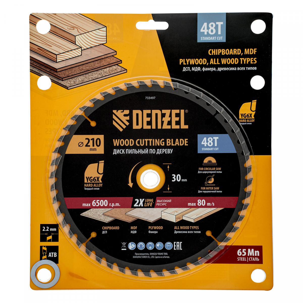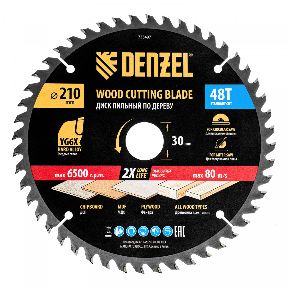 Пильный диск Denzel 733497 диаметром 210 x 30 мм, с 48 зубьями, предназначен для продольного и поперечного распила твердой и мягкой древесины, фанеры, МДФ, ДСП. 48 зубьев типа ATB с режущими пластинами оптимальной геометрии обеспечивают качественный рез. Тип реза — стандартный. Режущие пластины из твердого сплава YG6X сохраняют рабочие свойства при интенсивном использовании. Диск устанавливается на циркулярную, торцовочную пилу или на распиловочный станок. В комплект поставки входит переходное кольцо с 30 на 20 мм, что позволяет изменить посадочный размер и расширяет возможности использования диска.