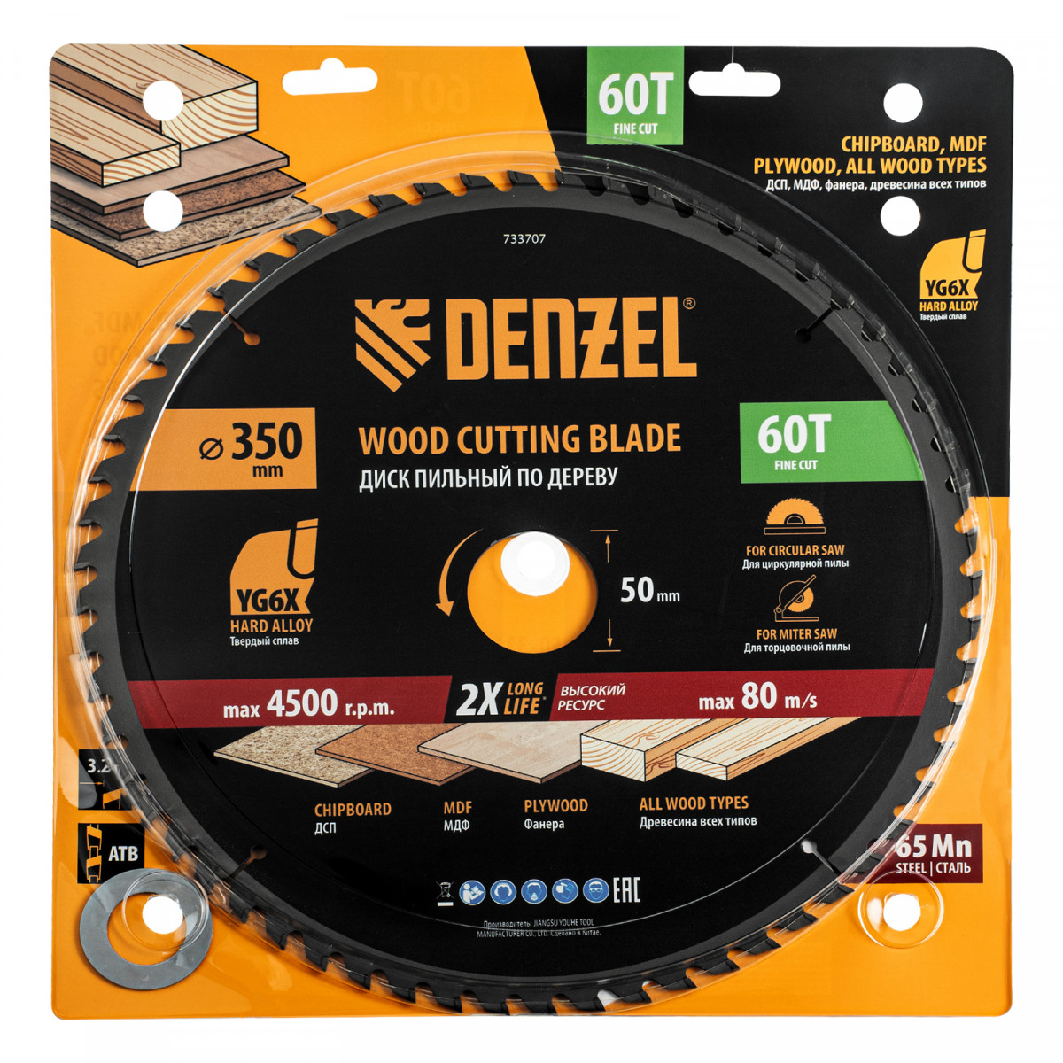 Пильный диск Denzel 733707 диаметром 350 x 50 мм, с 60 зубьями, предназначен для точного продольного и поперечного распила твердой и мягкой древесины, фанеры, МДФ, ДСП. 60 зубьев типа ATB с режущими пластинами оптимальной геометрии обеспечивают чистый рез. Режущие пластины из твердого сплава YG6X сохраняют рабочие свойства при интенсивном использовании. Диск устанавливается на циркулярную, торцовочную пилу или на распиловочный станок. В комплект поставки входит переходное кольцо с 50 на 32 мм, что позволяет изменить посадочный размер и расширяет возможности использования диска.