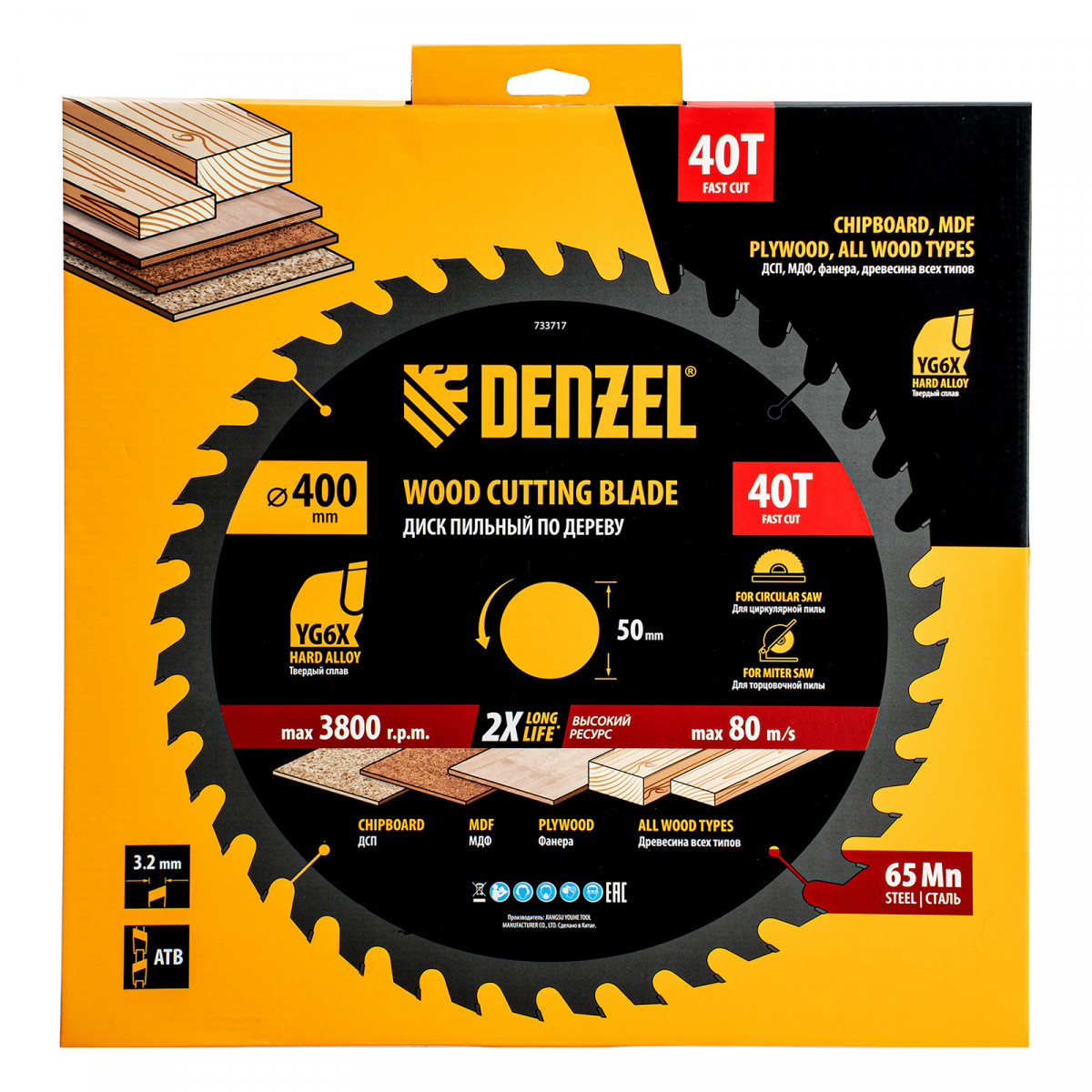 Пильный диск Denzel 733717 диаметром 400 x 50 мм, с 40 зубьями, предназначен для продольного и поперечного распила твердой и мягкой древесины, фанеры, МДФ, ДСП. 40 зубьев типа ATB с режущими пластинами оптимальной геометрии обеспечивают качественный рез. Тип реза — стандартный. Режущие пластины из твердого сплава YG6X сохраняют рабочие свойства при интенсивном использовании. Диск устанавливается на циркулярную, торцовочную пилу или на распиловочный станок. В комплект поставки входит переходное кольцо с 50 на 32 мм, что позволяет изменить посадочный размер и расширяет возможности использования диска.