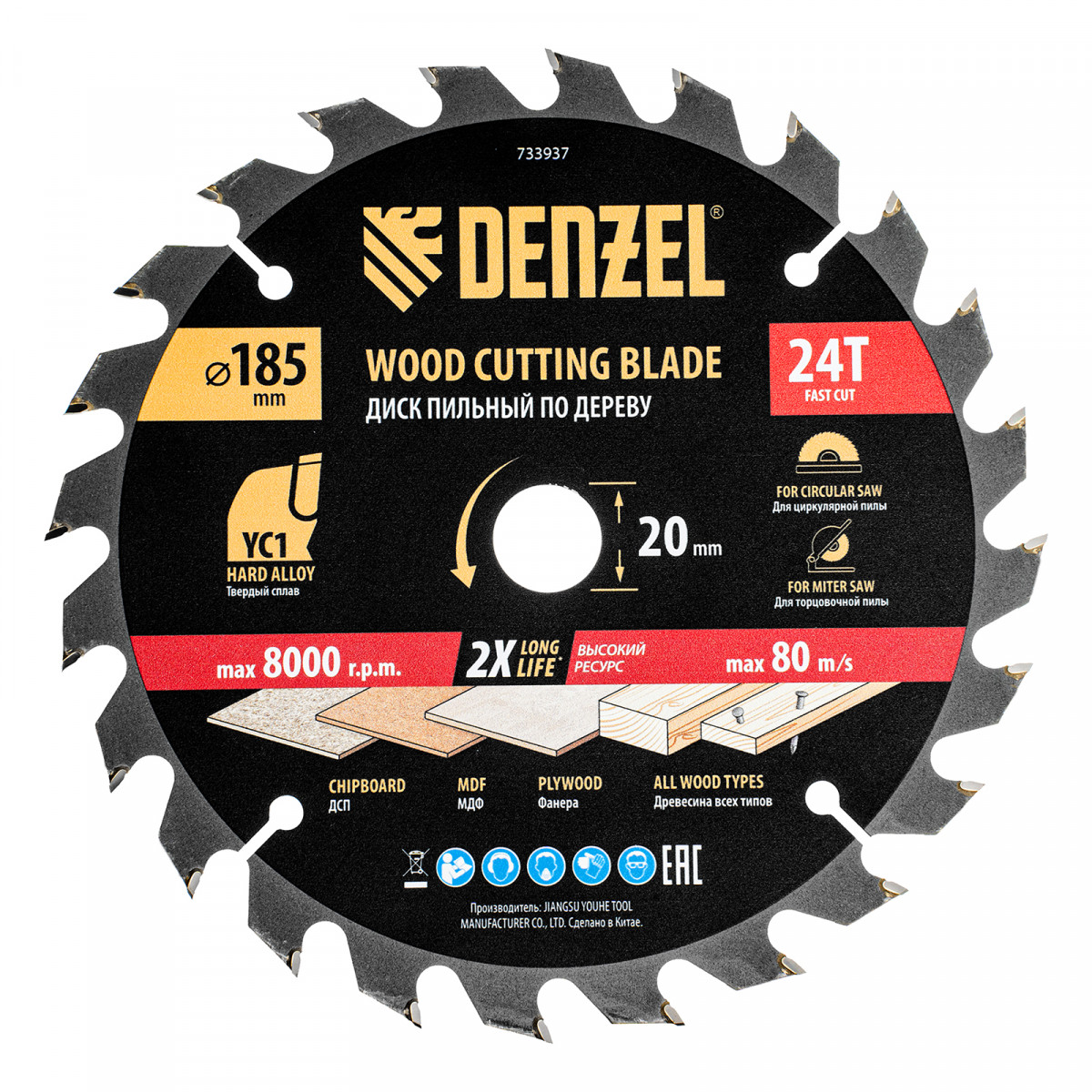 Пильный диск Denzel 733937 диаметром 185 x 20 мм, с 24 зубьями типа ATB, предназначен для быстрого продольного и поперечного распиливания древесины всех типов, в том числе с гвоздями и остатками бетона, а также ДСП, МДФ, фанеры. Режущие пластины из твердого сплава YC1, прошедшие многоступенчатую заточку, позволяют успешно справляться с прочными материалами. Диск устанавливается на циркулярную, торцовочную пилу или на распиловочный станок. В комплект поставки входит переходное кольцо 20/16 мм, позволяющее изменить посадочный диаметр при необходимости.